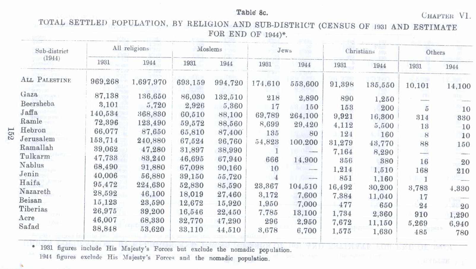 Total Settled Population By Religion and Sub-District(Census of 1931 and estimates of 1944*) in Palestine before Nakba. British Mandate: A Survey of Palestine: Volume I - Page 152. Chapter VI: Population: B. Geographical Distribution of the Population: |