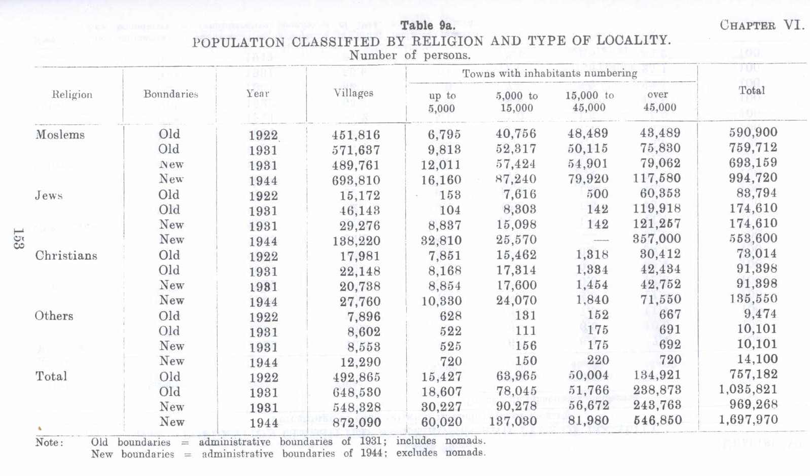 Population Classified by Religion and Type of Locality in Palestine before 1948 (Nakba). British Mandate: A Survey of Palestine: Volume I - Page 153. Chapter VI: Population: B. Geographical Distribution of the Population: Table 9a: |