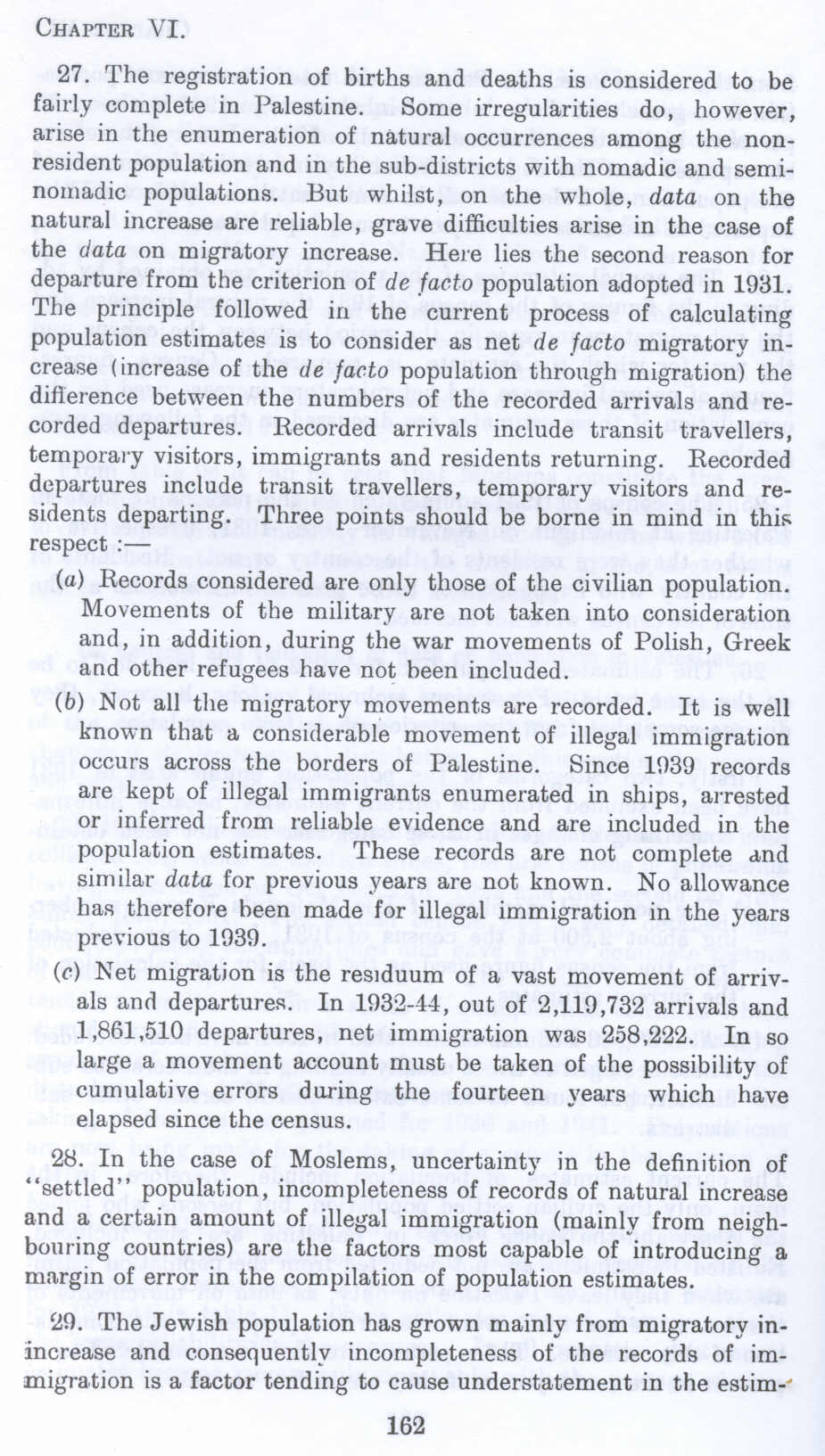 27. The registration of births and deaths is considered to be fairly complete in Palestine. Some irregularities do, however, arise in the enumeration of natural occurrences among the nonresident population and in the sub-districts with nomadic and semi nomadic populations. But whilst, on the whole, data on the natural increase are reliable, grave difficulties arise in the case of the data on migratory increase. Here lies the second reason for departure from the criterion of de facto population adopted in 1931. The principle followed in the current process of calculating population estimates is to consider as net de facto migratory increase (increase of the de facto population through migration) the difference between the numbers of the recorded arrivals and recorded departures, Recorded arrivals include transit travellers, temporary visitors, immigrants and residents returning. Recorded departures include transit travellers, temporary visitors and residents departing. Three points should be borne in mind in this respect:-