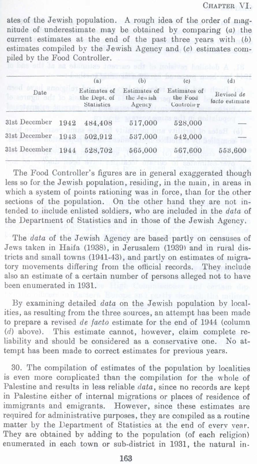 The Food Controller's figures are in general exaggerated though less so for the Jewish population, residing, in the main, in areas in which a system of points rationing was in force, than for the other sections of the population. On the other band they are not intended to include enlisted soldiers, who are included in the data of the Department of Statistics and in those of the Jewish Agency.