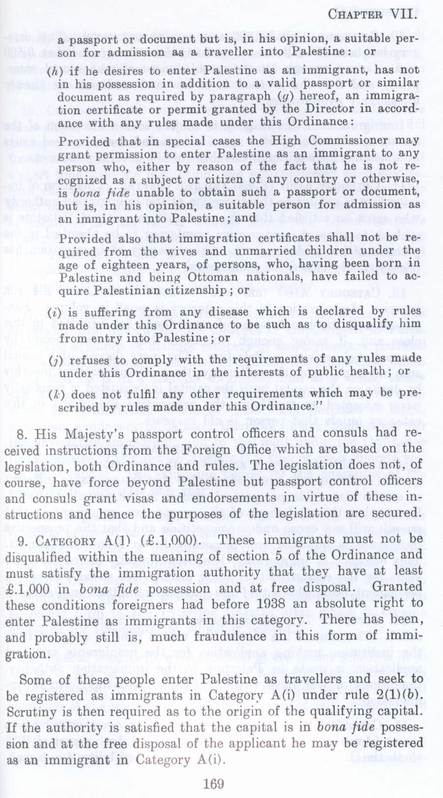9. CATEGORY A(1) (£.1,000). These immigrants must not be disqualified within the meaning of section 5 of the Ordinance and must satisfy the immigration authority that they have at least £.1,000 in bona fide possession and at free disposal. Granted these conditions foreigners had before 1038 an absolute right to enter Palestine as immigrants in this category. There has been, and probably still is, much fraudulence in this form of immigration.