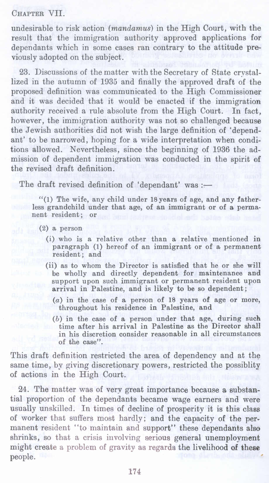 23. Discussions of the matter with the Secretary of State crystallized in the autumn of Hl35 and finally the approved draft of the proposed definition was communicated to the High Commissioner and it was decided that it would be enacted if the immigration authority received a rule absolute from the High Court. In fact, however, the immigration authority was not so challenged because the Jewish authorities did not wish the large definition of 'dependant' to be narrowed, hoping for a wide interpretation when conditions allowed. Nevertheless, since the beginning of 1936 the admission of dependent immigration was conducted in the spirit of the revised draft definition.