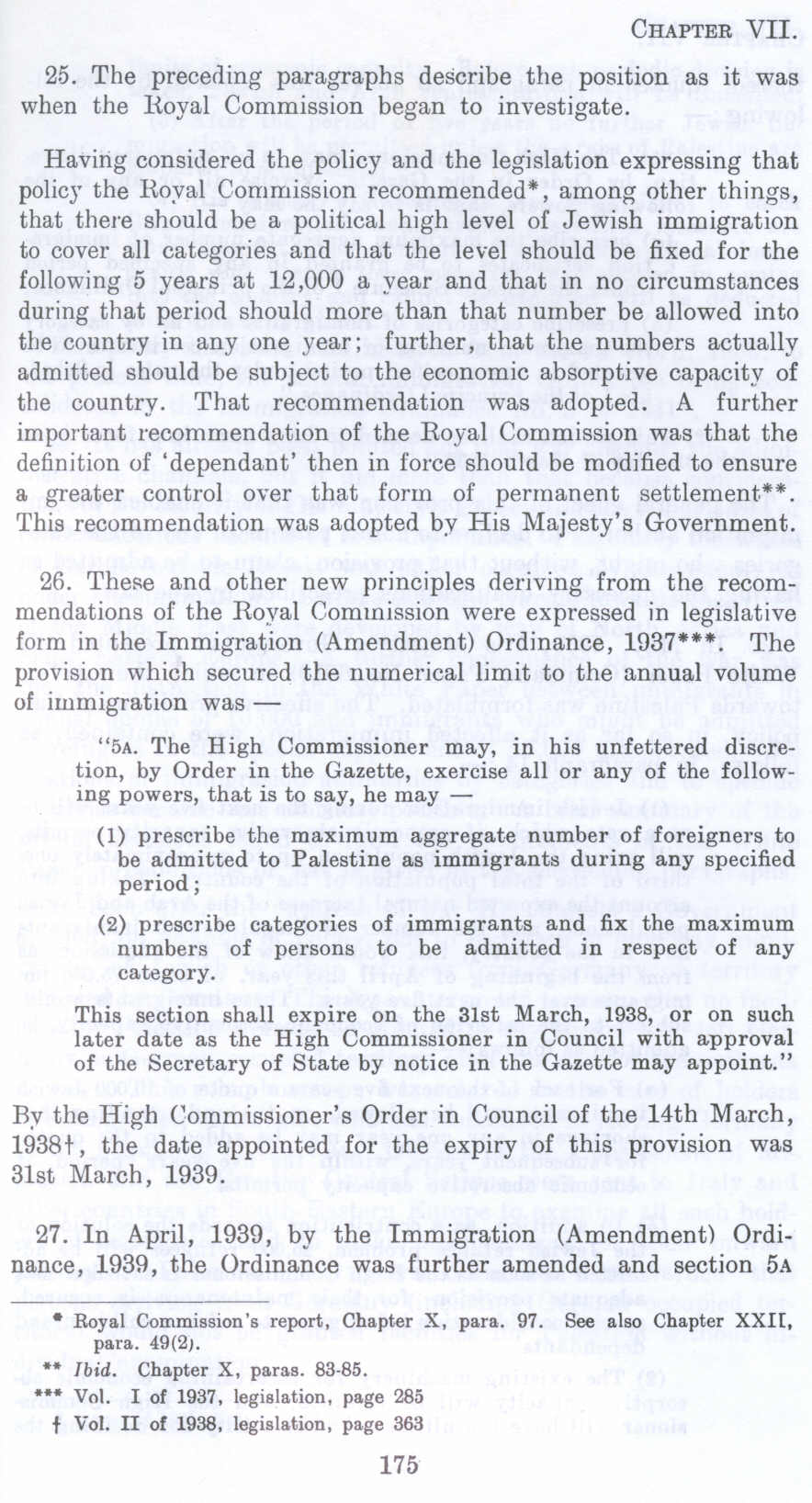 Having considered the policy and the legislation expressing that policy the Royal Commission recommended", among other things, that there should be a political high level of Jewish immigration to cover all categories and that the level should be fixed for the following 5 years at 12,000 a year and that in no circumstances during that period should more than that number be allowed into the country in any one year; further, that the numbers actually admitted should be subject to the economic absorptive capacity of the country. That recommendation was adopted. A further important recommendation of the Royal Commission was that the definition of 'dependant' then in force should be modified to ensure a greater control over that form of permanent settlement. This recommendation was adopted by His Majesty's Government.