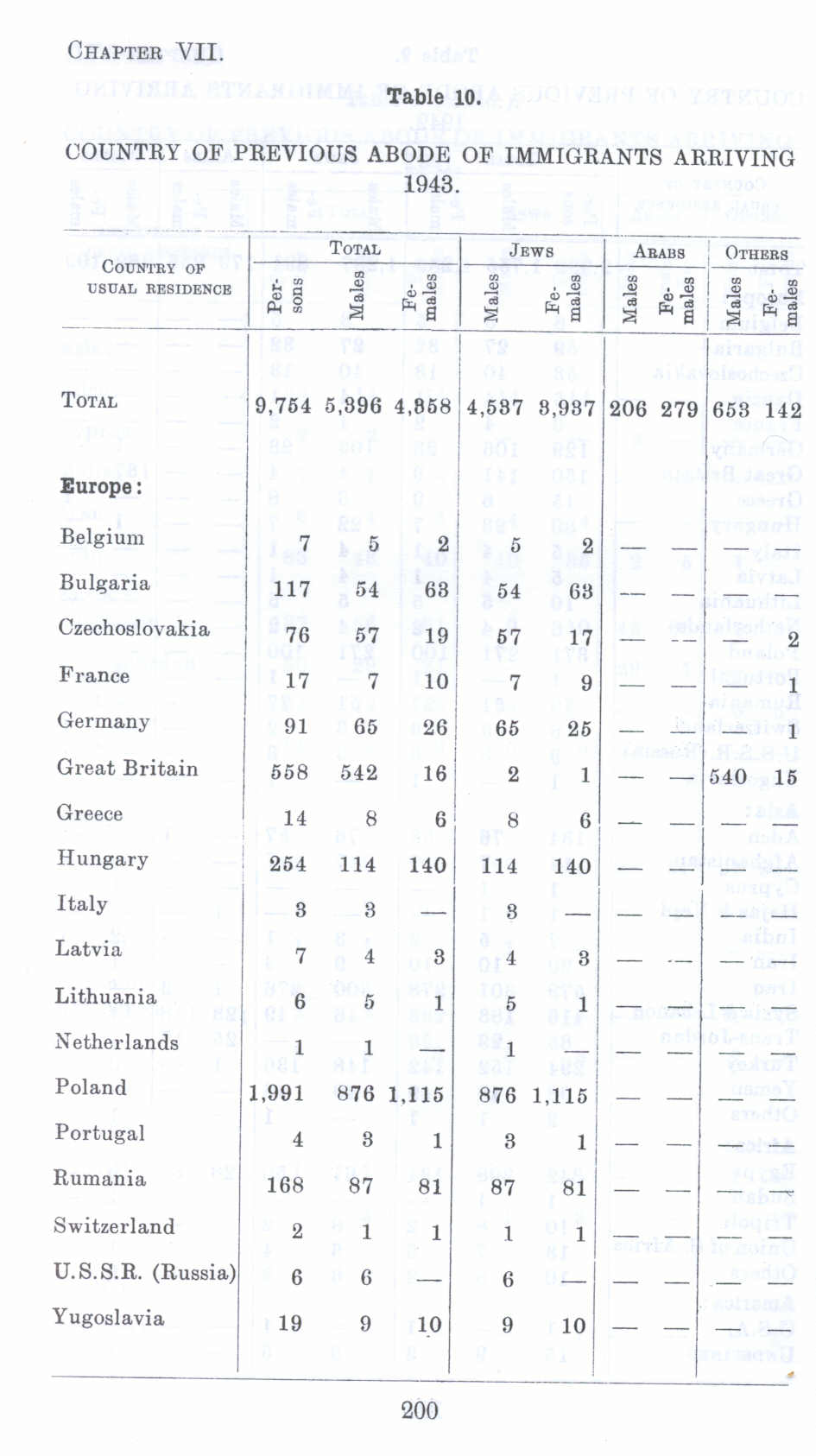 Country of Previous Origin of Immigration Arriving 1943 to Palestine, British Mandate: A Survey of Palestine: Volume I - Page 200. Chapter VII: Immigration: Section 2 Immigration Statistics: Table 10: |