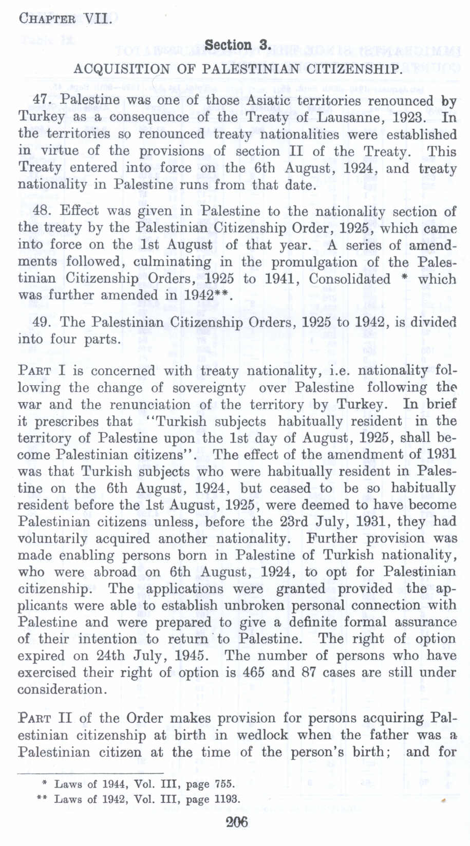 48. Effect was given in Palestine to the nationality section of the treaty by the Palestinian Citizenship Order, 1925, which came into force on the 1st August of that year. A series of amendments followed, culminating in the promulgation of the Palestinian Citizenship Orders, 1925 to 1941, Consolidated * which was further amended in 1942**.
