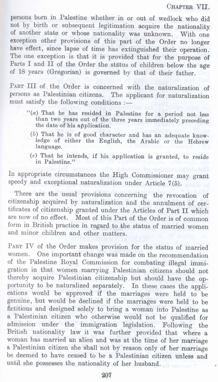 PART IV of the Order makes provision for the status of married women. One important change was made on the recommendation of the Palestine Royal Commission for combating illegal immigration in that women marrying Palestinian citizens should not thereby• acquire Palestinian citizenship but should have the opportunity to be naturalized separately. In these cases the applications would be approved if the marriages were held to be genuine, but would be declined if the marriages were held to be fictitious and designed solely to bring a woman into Palestine as a Palestinian citizen who otherwise would not be qualified for admission under the immigration legislation. Following the British nationality law it was further provided that where a woman has married an alien and was at the time of her marriage a Palestinian citizen she shall not by reason only of her marriage be deemed to have ceased to be a Palestinian citizen unless and until she possesses the nationality of her husband.