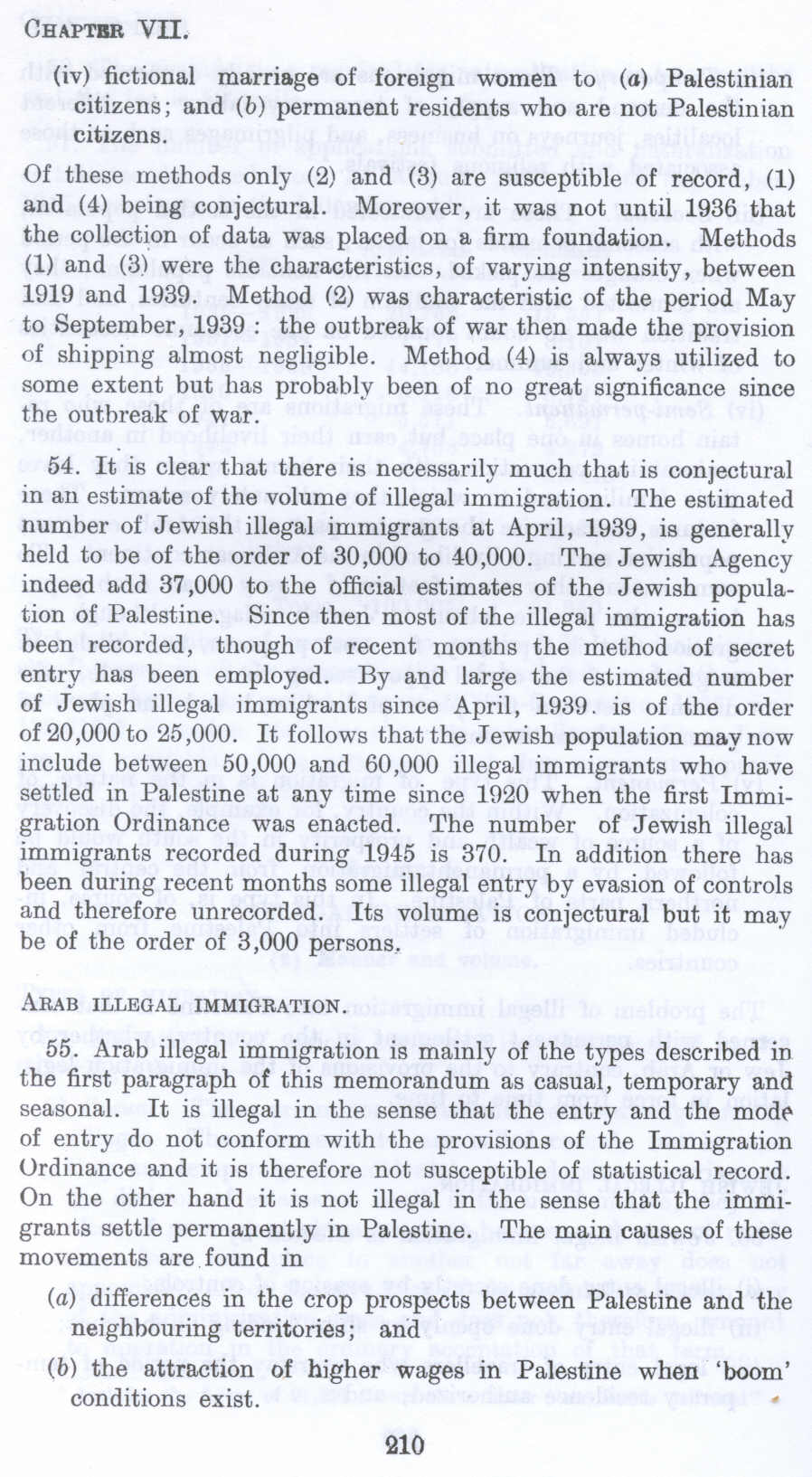 55. Arab illegal immigration is mainly of the types described in the first paragraph of this memorandum as casual, temporary and seasonal. It is illegal in the sense that the entry and the mode of entry do not conform with the provisions of the Immigration Ordinance and it is therefore not susceptible of statistical record. On the other hand it is not illegal in the sense that the immigrants settle permanently in Palestine. The main causes of these movements are found in