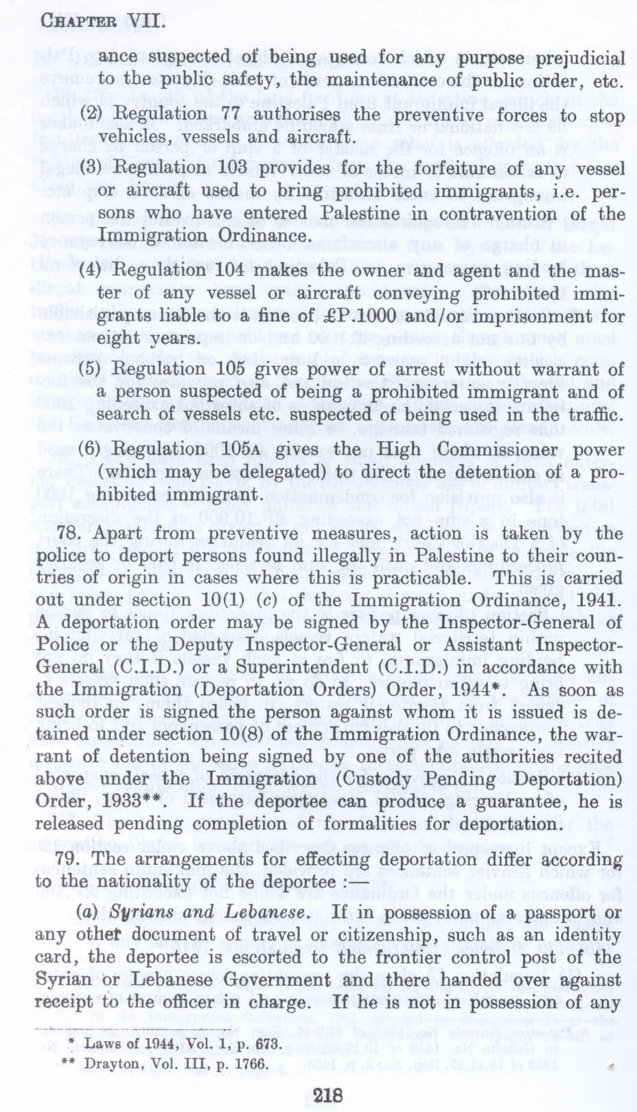 78. Apart from preventive measures, action is taken by the police to deport persons found illegally in Palestine to their countries of origin in cases where this is practicable. This is carried out under section 10(1) (c) of the Immigration Ordinance, 1941. A deportation order may be signed by the Inspector-General of Police or the Deputy Inspector-General or Assistant Inspector General (C.I.D.) or a Superintendent (C.I.D.) in accordance with the Immigration (Deportation Orders) Order, 1944 *. As soon as such order is signed the person against whom it is issued is detained under section 10 (8) of the Immigration Ordinance, the warrant of detention being signed by one of the authorities recited above under the Immigration (Custody Pending Deportation) Order, 1933... If the deportee can produce a guarantee, he is released pending completion of formalities for deportation.