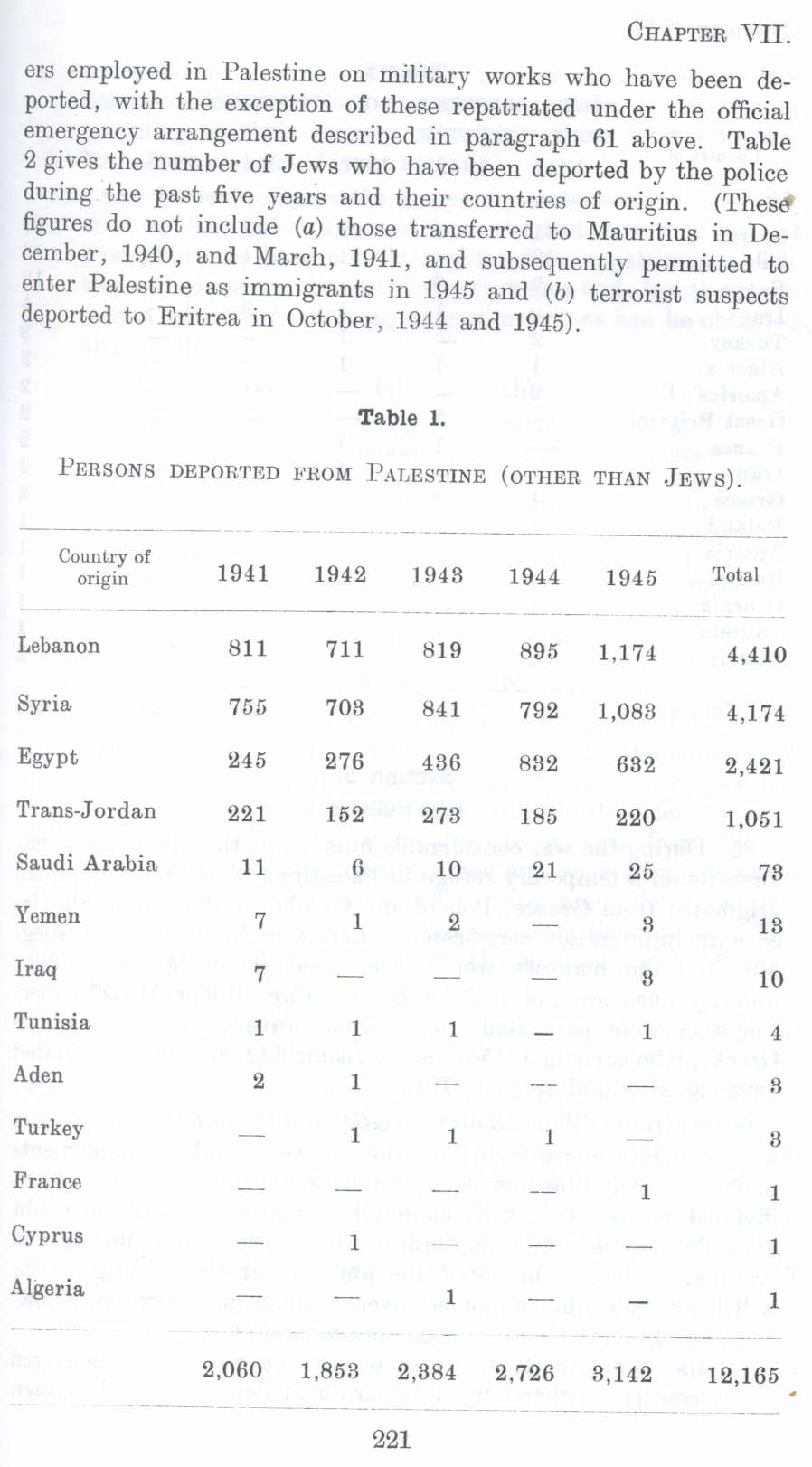 labourers employed in Palestine on military works who have been deported, with the exception of these repatriated under the official emergency arrangement described in paragraph 61 above. Table 2 gives the number of Jews who have been deported by the police during the past five years and their countries of origin. (These figures do not include (a) those transferred to Mauritius in December, 1940, and March, 1941, and subsequently permitted to enter Palestine as immigrants in 1945 and (b) terrorist suspects deported to Eritrea in October, 1944 and 1945).