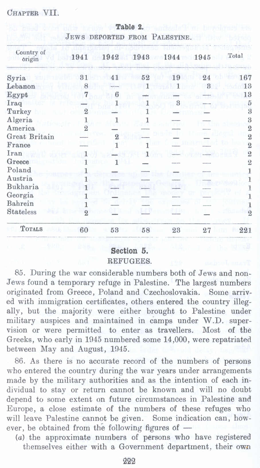 86. As there is no accurate record of the numbers of persons who entered the country during the war years under arrangements made by the military authorities and as the intention of each individual to stay or return cannot be known and will no doubt depend to some extent on future circumstances in Palestine and Europe, a close estimate of the numbers of these refuges who will leave Palestine cannot be given. Some indication can, however, be obtained from the following figures of -
