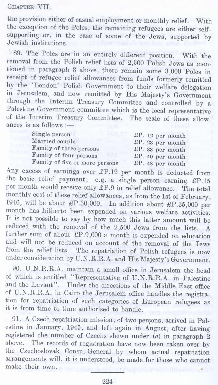 89. The Poles are in an entirely different position. With the removal from the Polish relief lists of 2,500 Polish Jews as mentioned in paragraph 3 above, there remain some 3,000 Poles in receipt of refugee relief allowances from funds formerly remitted by the 'London' Polish Government to their welfare delegation in Jerusalem, and now remitted by His Majesty's Government through the Interim Treasury Committee and controlled by a Palestine Government committee which is the local representative of the Interim Treasury Committee. The scale of these allowances is as follows :-