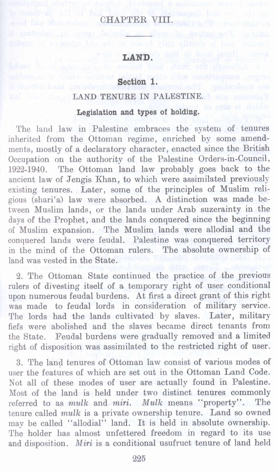 Land Tenure in Palestine. Legislation and Type of Holding, British Mandate: A Survey of Palestine: Volume I - Page 225. Chapter VIII: Land: Section 1 |