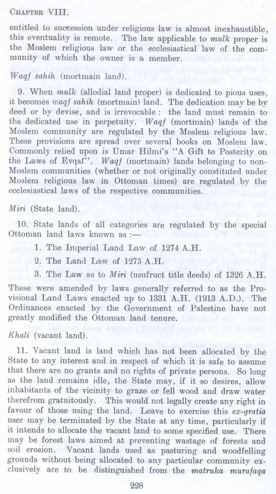 9. When mulk (allodial land proper) is dedicated to pious uses, it becomes waqf sahih (mortmaiu) land. The dedication may be by deed or by devise, and is irrevocable : the land must remain to the dedicated use in perpetuity. Waqf (mortmain) lands of the Moslem community are regulated by the Moslem religious law. These provisions are spread over several books on Moslem law. Commonly relied npon is Umar Hilmi's "A Gift to Posterity on the Laws of Evqaf". Waqf (mortmain) lands belonging to non Moslem communities (whether or not originally constituted under Moslem religious law in Ottoman times) are regulated by the ecclesiastical laws of the respective communities.