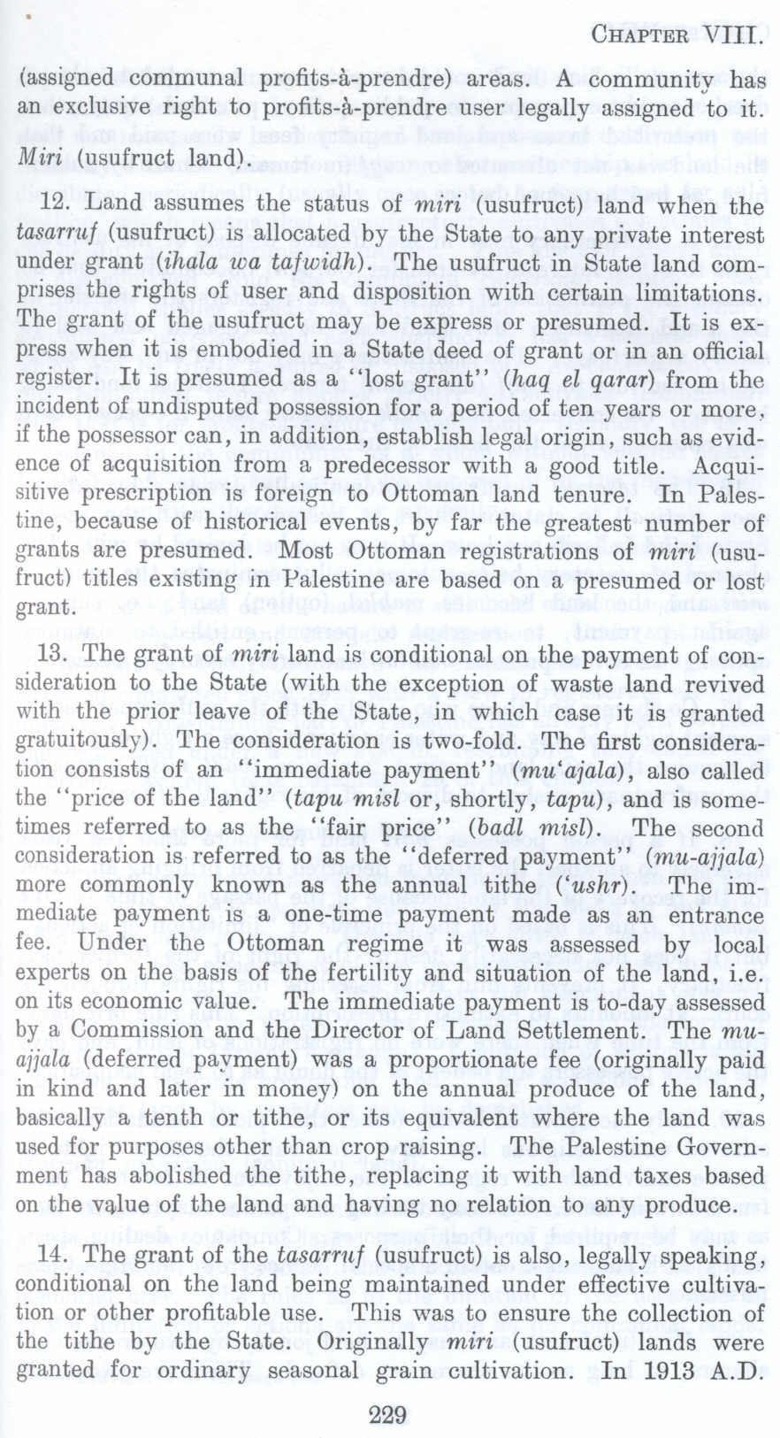 14. The grant of the tasarruf (usufruct) is also, legally speaking, conditional on the land being maintained under effective cultivation or other profitable use. This was to ensure the collection of the tithe by the State. Originally miri (usufruct) lands were granted for ordinary seasonal grain cultivation. In 1913 A.D.