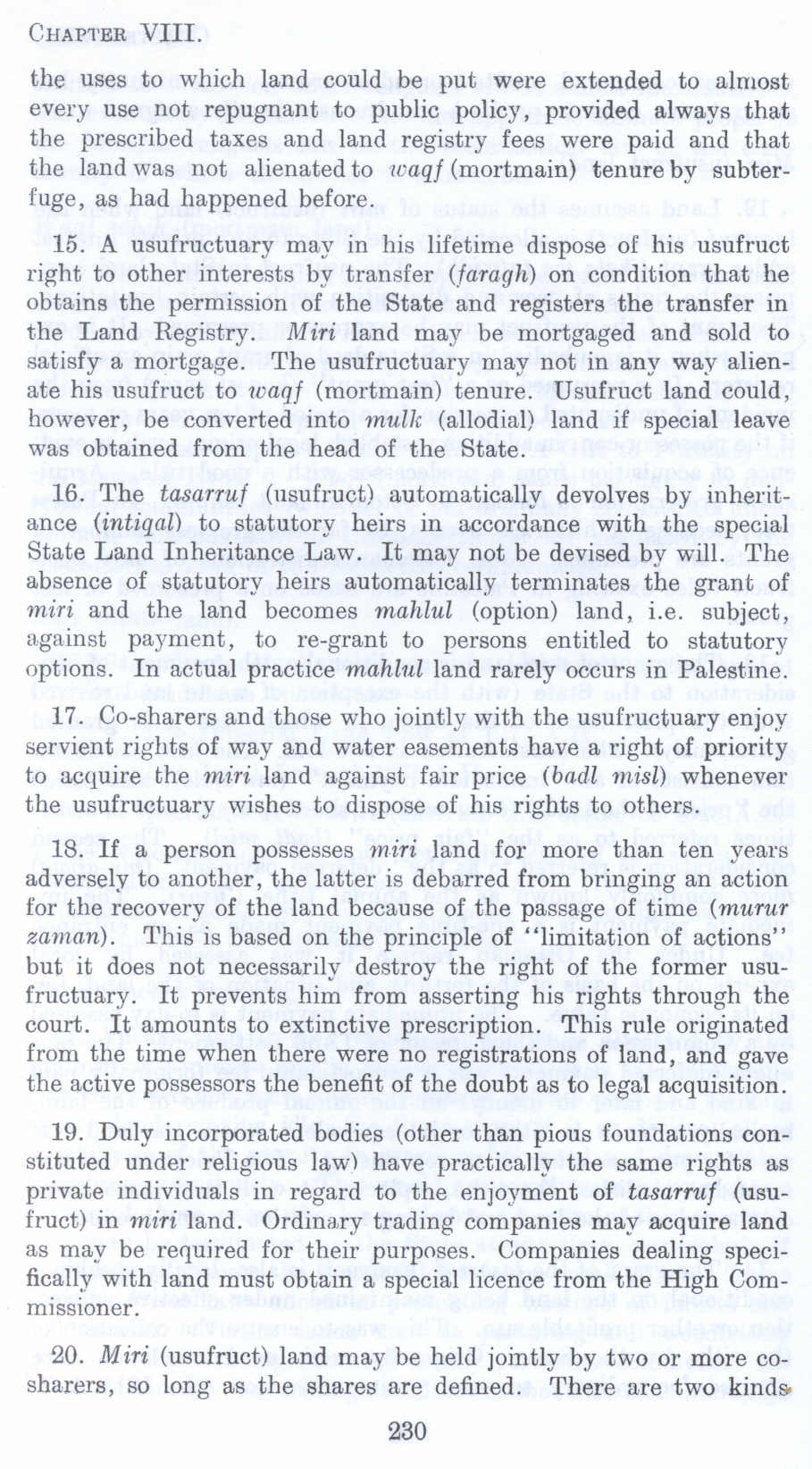 19. Duly incorporated bodies (other than pious foundations constituted under religious law) have practically the same rights as private individuals in regard to the enjoyment of tasarruf (usufruct) in miri land. Ordinary trading companies may acquire land as may be required for their purposes. Companies dealing specifically with land must obtain a special licence from the High Commissioner.