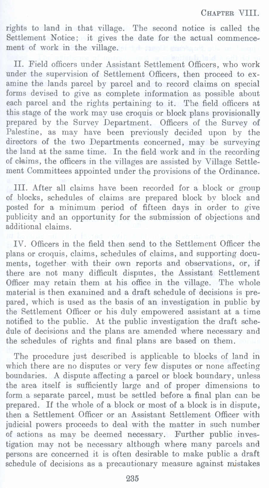II. Field officers under Assistant Settlement Officers, who work under the supervision of Settlement Officers, then proceed to examine the lands parcel by parcel and to record claims on special forms devised to give as complete information as possible about each parcel and the rights pertaining to it. The field officers at this stage of the work may use croquis or block plans provisionally prepared by the Survey Department. Officers of the Survey of Palestine, as may have been previously decided upon by the directors of the two Departments concerned, may be surveying the land at the same time. In the field work and in the recording of claims, the officers in the villages are assisted by Village Settlement Committees appointed under the provisions of the Ordinance.