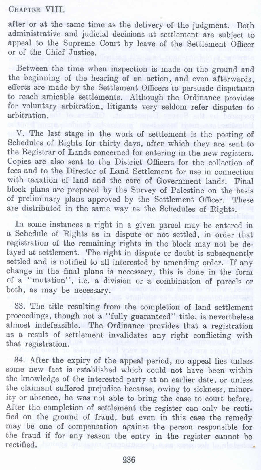 V. The last stage in the work of settlement is the posting of Schedules of Rights for thirty days, after which they are sent to the Registrar of Lands concerned for entering in the new registers. Copies are also sent to the District Officers for the collection of fees and to the Director of Land Settlement for use in connection with taxation of land and the care of Government lands. Final block plans are prepared by the Survey of Palestine on the basis of preliminary plans approved by the Settlement Officer. These are distributed in the same way as the Schedules of Rights.