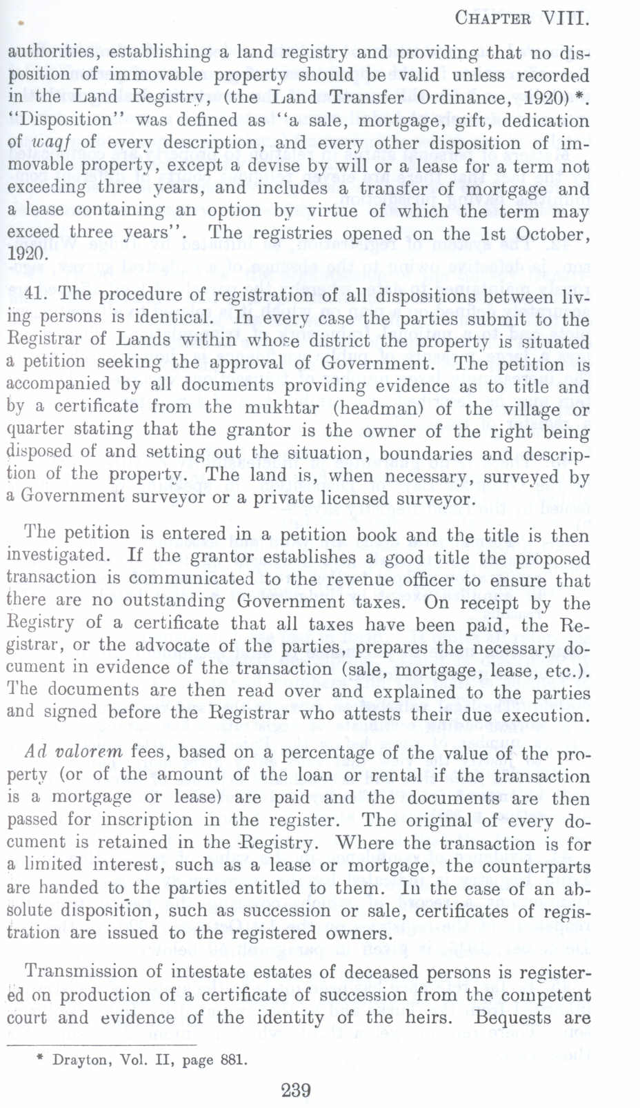 41. The procedure of registration of all dispositions between living persons is identical. In every case the parties submit to the Registrar of Lands within whose district the property is situated a petition seeking the approval of Government. The petition is accompanied by all documents providing evidence as to title and by a certificate from the mukhtar (headman) of the village or quarter stating that the granter is the owner of the right being disposed of and setting out the situation, boundaries and description of the property. The land is, when necessary, surveyed by a Government surveyor or a private licensed surveyor.