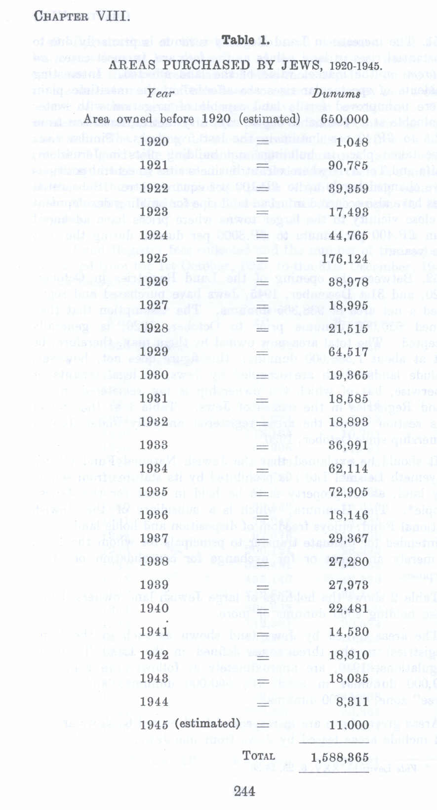 Land Registration in Palestine Before 1948 (Nakba): Table showing Areas Purchased by Jews, 1920 - 1945, British Mandate: A Survey of Palestine: Volume I - Page 244. Chapter VIII: Land: Section 3 |