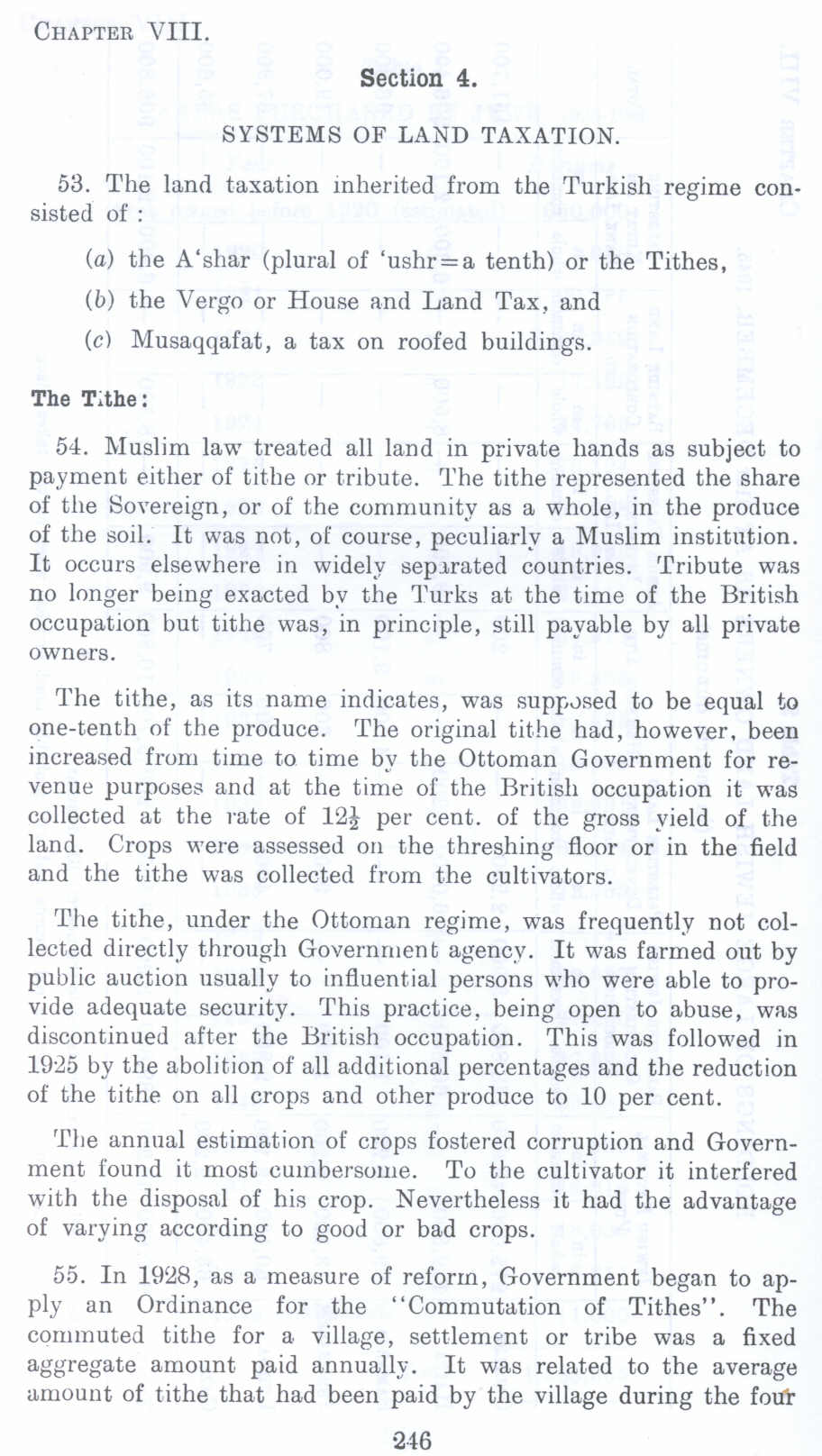 Land Taxation in Palestine before 1948 (Nakba): The Tithe, British Mandate: A Survey of Palestine: Volume I - Page 246. Chapter VIII: Land: Section 4: |