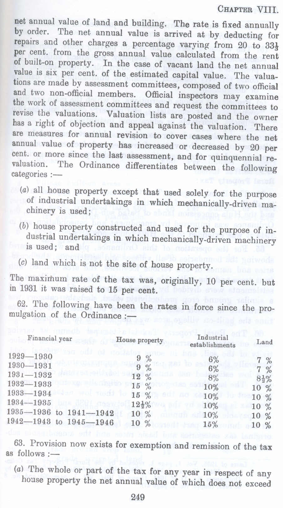 net annual value of land and building. The rate is fixed annually by order. The net. annual value is arrived at by deducting for repairs and other charges a percentage varying from 20 to 33! per cent. from the gross annual value calculated from the rent of built-on property. In the case of vacant land the net annual value is six per cent. of the estimated capital value. The valuations are made by assessment committees, composed of two official and two non-official members. Official inspectors may examine the work of assessment committees and request the committees to revise the valuations. Valuation lists are posted and the owner has a right of objection and appeal against the valuation. There are measures for annual revision to cover cases where the net annual value of property has increased or decreased by 20 per cent. or more since the last assessment, and for quinquennial revaluation. The Ordinance differentiates between the following categories :-