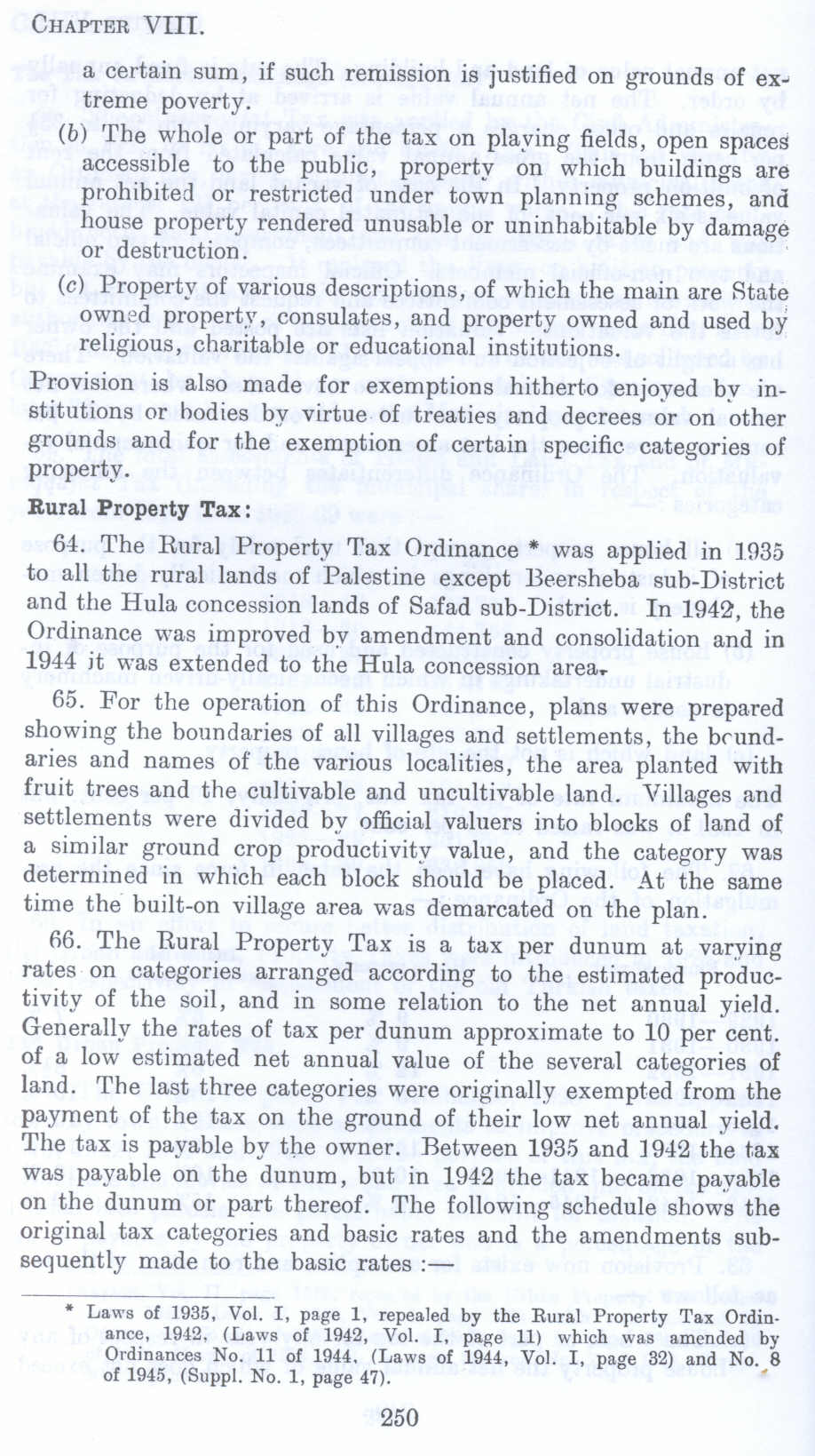64. The Rural Property Tax Ordinance * was applied in 1035 to all the rural lands of Palestine except Beersheba sub-District and the Hula concession lands of Safad sub-District. In 1942, the Ordinance was improved by amendment and consolidation and in 1944 it was extended to the Hula concession area.