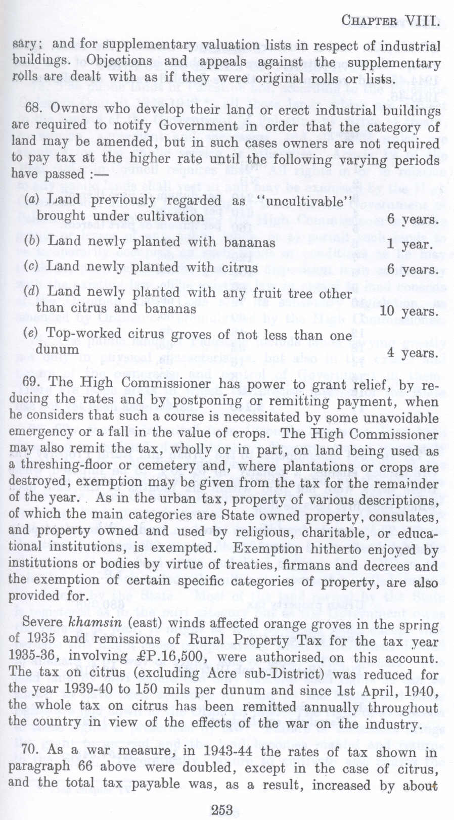 69. The High Commissioner has power to grant relief, by reducing the rates and by postponing or remitting payment, when he considers that such a course is necessitated by some unavoidable emergency or a fall in the value of crops. The High Commissioner may also remit the tax, wholly or in part, on land being used as a threshing-floor or cemetery and, where plantations or crops are destroyed, exemption may be given from the tax for the remainder of the year. As in the urban tax, property of various descriptions, of which the main categories are State owned property, consulates, and property owned and used by religious, charitable, or educational institutions, is exempted. Exemption hitherto enjoyed by institutions or bodies by virtue of treaties, firm ans and decrees and the exemption of certain specific categories of property, are also provided for.