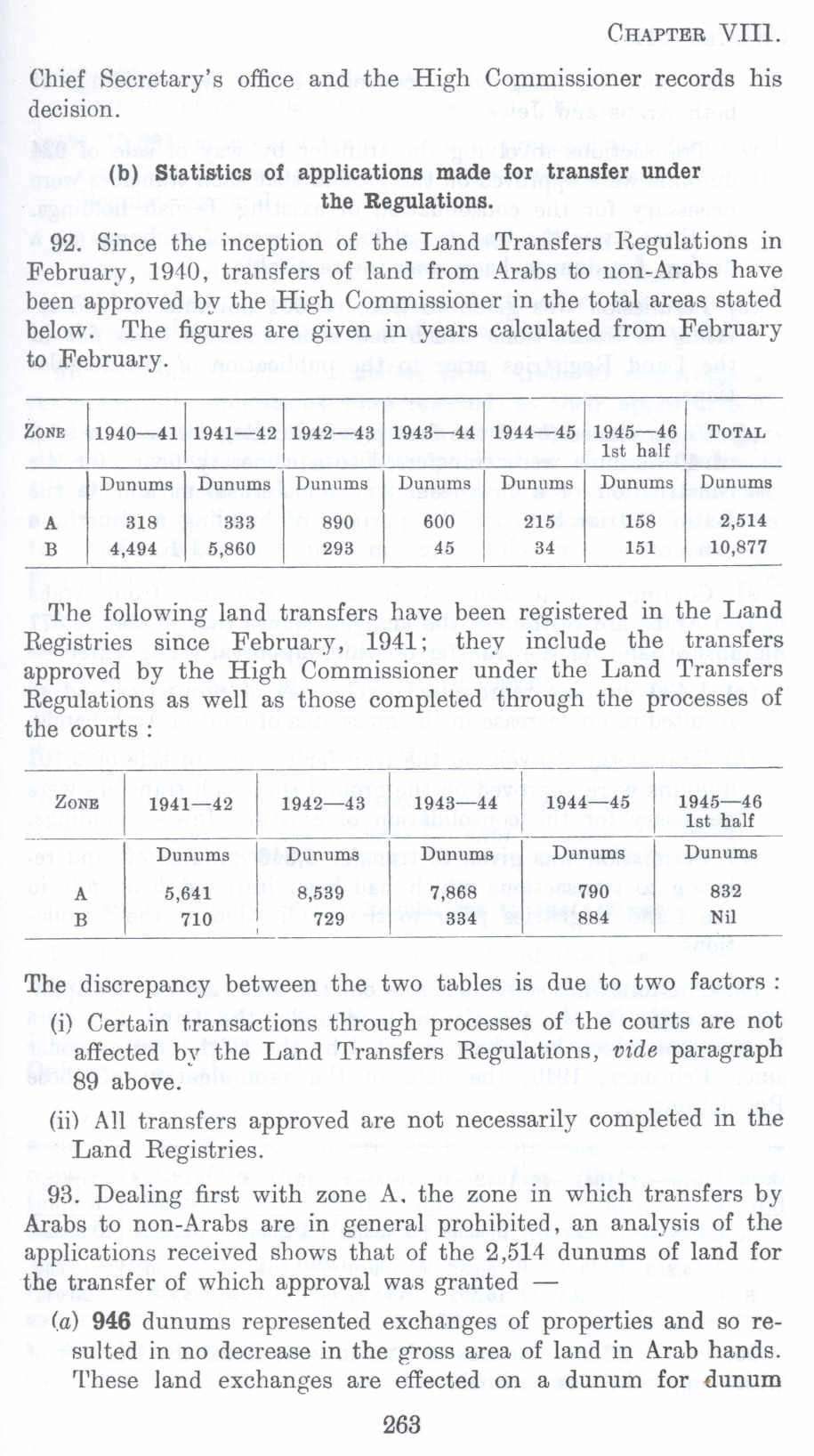 The Land Transfer Regulation in Palestine before 1948 (Nakba): (b) Statistics of Applications Made for Transfer under the Regulations, British Mandate: A Survey of Palestine: Volume I - Page 263. Section 7 |