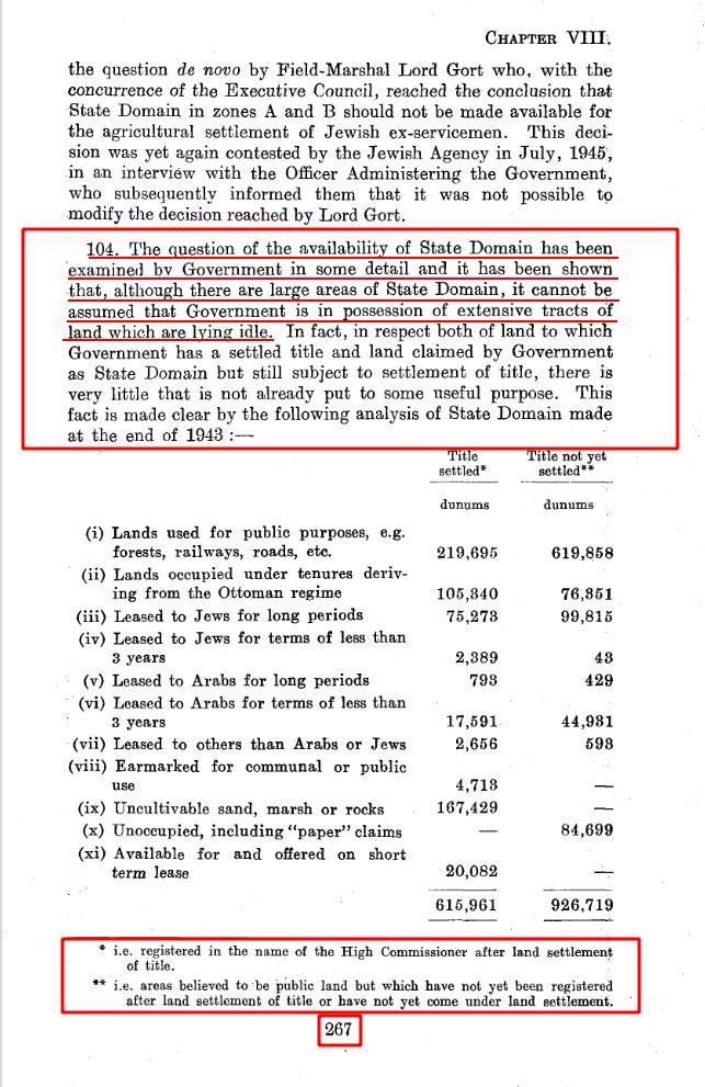 104. The question of the availability of State Domain has been examined by Government in some detail and it has been shown that, although there are large areas of State Domain, it cannot be assumed that Government is in possession of extensive tracts of land which are lying idle. In fact, in respect both of land to which Government has a settled title and land claimed by Government as State Domain but still subject to settlement of title, there Is very little that is not already put to some useful purpose. This fact is made clear by the following analysis of State Domain made at the end of 1943 :-