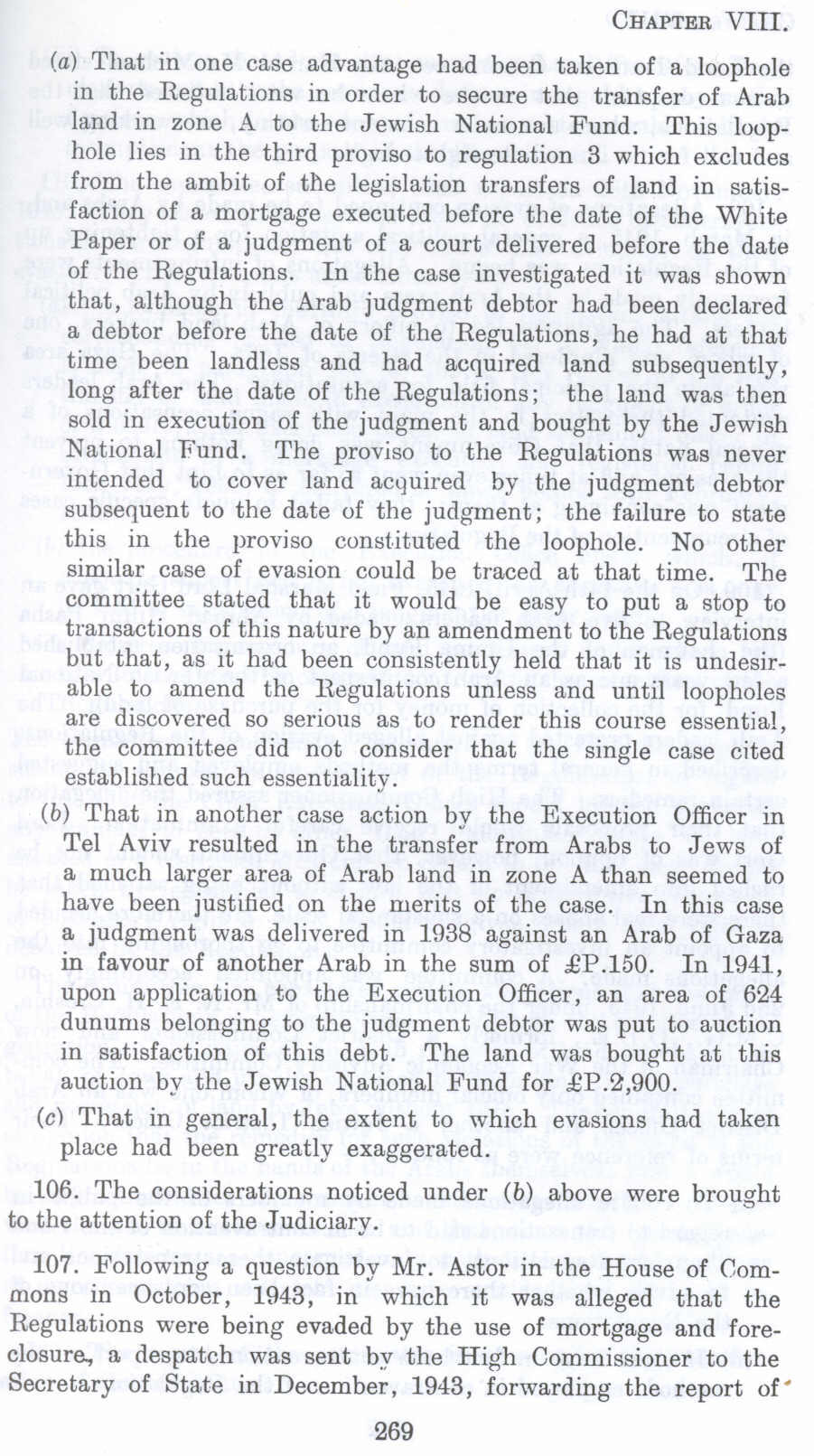 (a) That in one case advantage bad been taken of a loophole in the Regulations in order to secure the transfer of Arab land in zone A to the Jewish National Fund. This loophole lies in the third proviso to regulation 3 which excludes from the ambit of tl'le legislation transfers of land in satisfaction of a mortgage executed before the date of the White Paper or of a judgment of a court delivered before the date of the Regulations. In the case investigated it was shown that, although the Arab judgment debtor bad been declared a debtor before the date of the Regulations, be had at that time been landless and had acquired land subsequently, long after the date of the Regulations; the land was then sold in execution of the judgment and bought by the Jewish National Fund. The proviso to the Regulations was never intended to cover land acquired by the judgment debtor subsequent to the date of the judgment; the failure to state this in the proviso constituted the loophole. No other similar case of evasion could be traced at that time. The committee stated that it would be easy to put a stop to transactions of this nature by an amendment to the Regulations but that, as it bad been consistently held that it is undesirable to amend the Regulations unless and until loopholes are discovered so serious as to render this course essential, the committee did not consider that the single case cited established such essentiality.