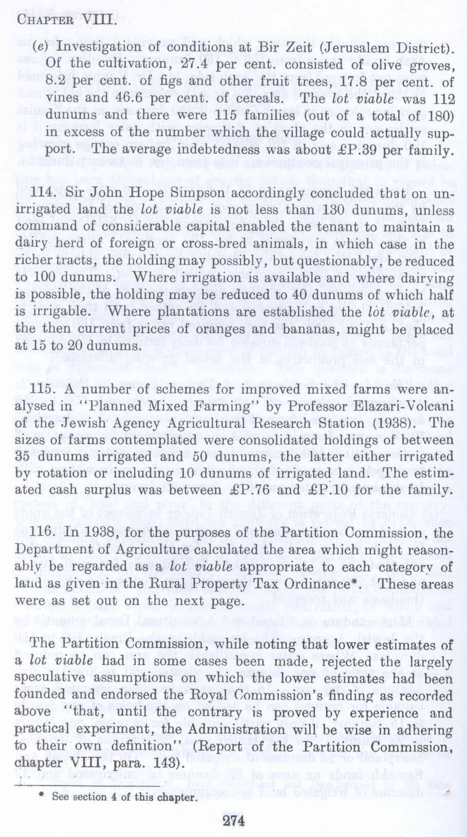 The Partition Commission, while noting that lower estimates of a lot viable bad in some cases been made, rejected the largely speculative assumptions on which the lower estimates had been founded and endorsed the Royal Commission's finding as recorrled above "that, until the contrary is proved by experience and practical experiment, the Administration will be wise in adhering to their own definition" (Report of the Partition Commission, chapter VIII, para. 143).