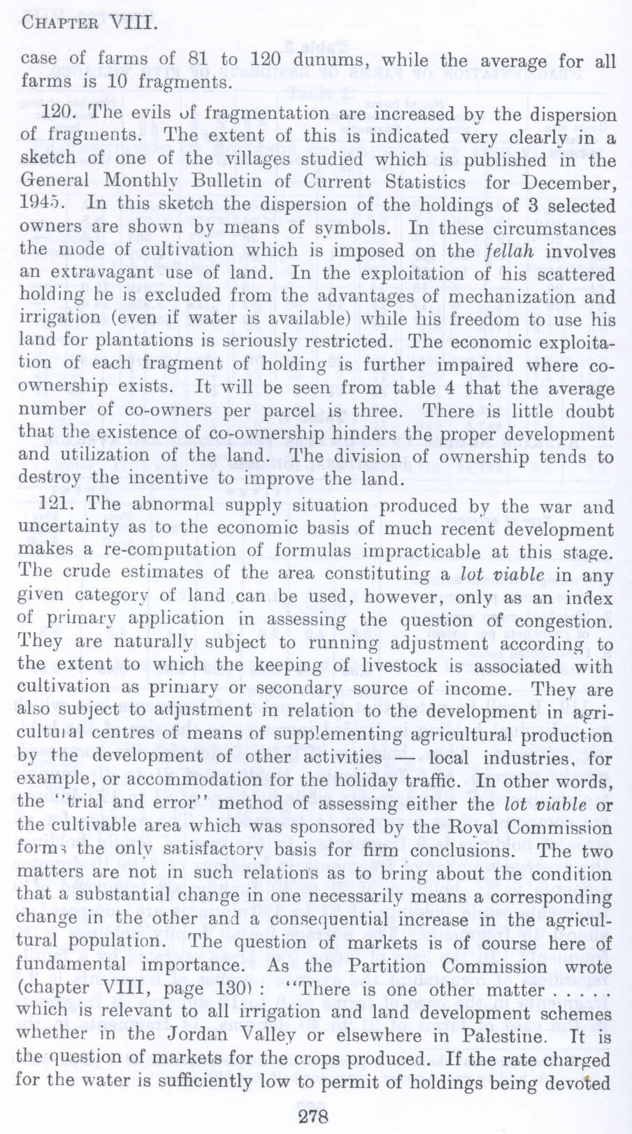 121. The abnormal supply situation produced by the war and uncertainty as to the economic has is of much recent development makes a re-computation of formulas impracticable at this stage. The crude estimates of the area constituting a lot viable in any given category of land can be used, however, only as an index of primary application in assessing the question of congestion. They are naturally subject to running adjustment according to the extent to which the keeping of livestock is associated with cultivation as primary or secondary source of income. They are also subject to adjustment in relation to the development in agricultural centres of means of supplementing agricultural production by the development of other activities - local industries, for example, or accommodation for the holiday traffic. In other words, the "trial and error" method of assessing either the lot viable or the cultivable area which was sponsored by the Royal Commission forms the only satisfactory has is for firm conclusions. The two matters are not in such relations as to bring about the condition that a substantial change in one necessarily means a corresponding change in the other and a consequential increase in the agricultural population. The question of markets is of course here of fundamental importance. As the Partition Commission wrote (chapter VIII, page 1301 : "There is one other matter ..... which is relevant to all irrigation and land development schemes whether in the Jordan Valley or elsewhere in Palestine. It is the question of markets for the crops produced. If the rate charged for the water is sufficiently low to permit of holdings being devoted