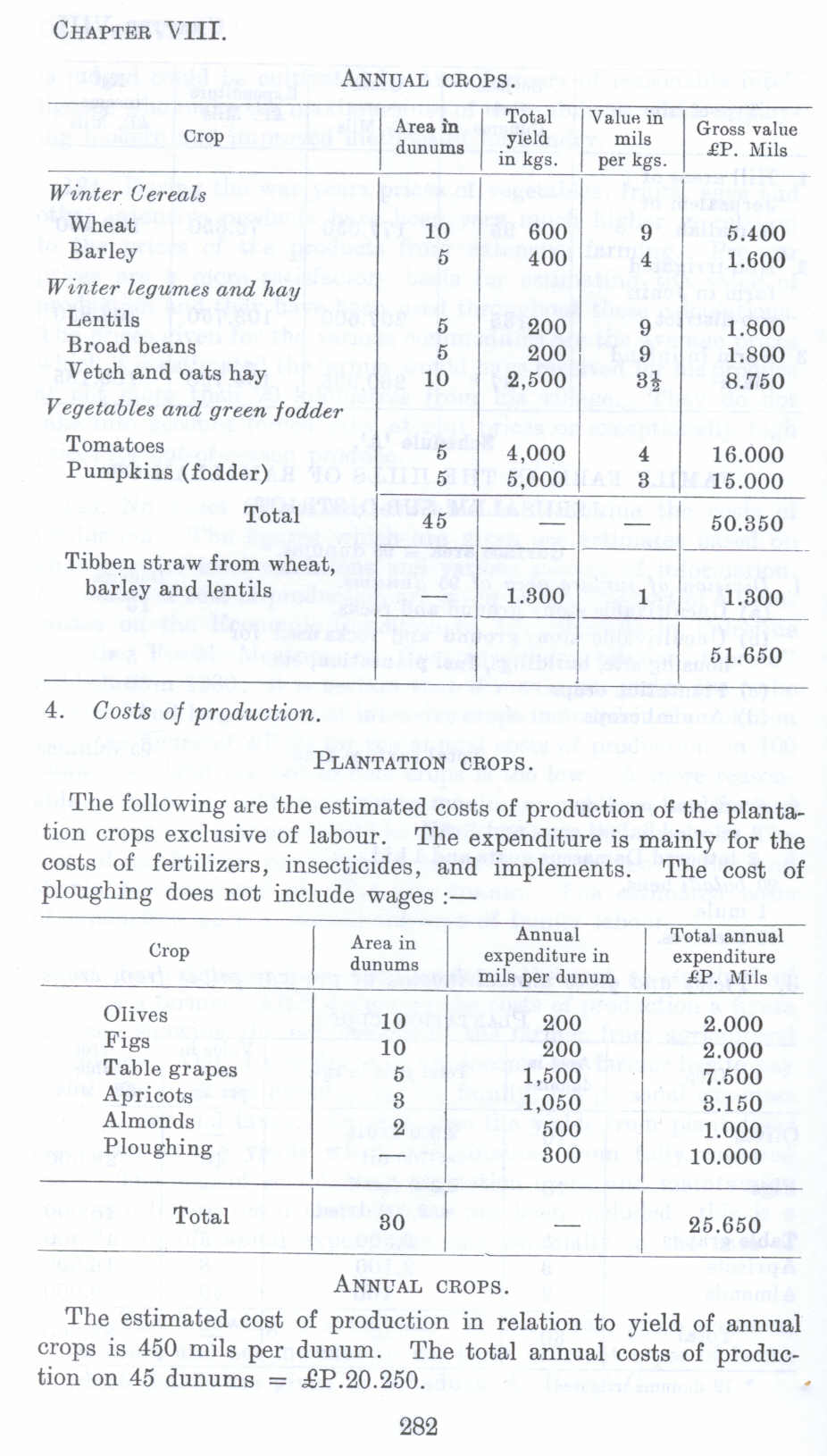 The estimated cost of production in relation to yield of annual crops is 450 mils per dunum. The total annual costs of production on 45 dunums = £P.20.250.