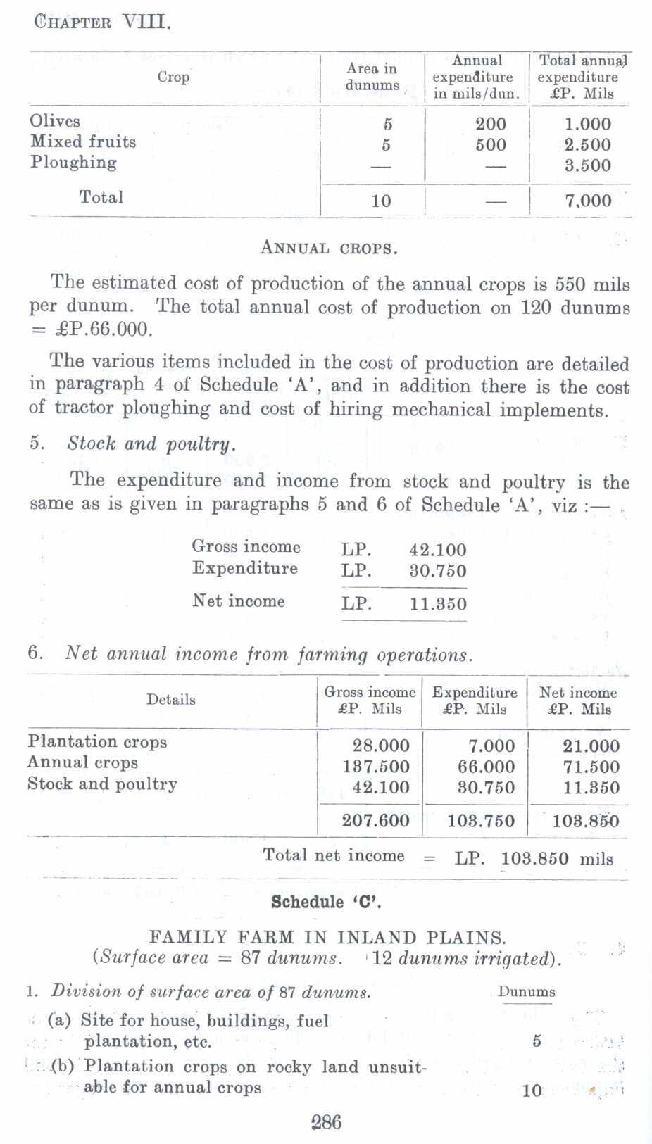 The estimated cost of production of the annual crops is 550 mils per dunum. The total annual cost of production on 120 dunums = £P.66.000.