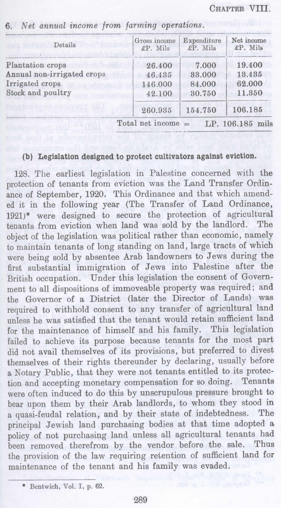 Legislation designed to protect cultivators against eviction in Palestine before 1948 (Nakba), British Mandate: A Survey of Palestine: Volume I - Page 289. Section 8: Administrative Problems Regarding to State Holdings : Net annual income from farming operations. (b) |