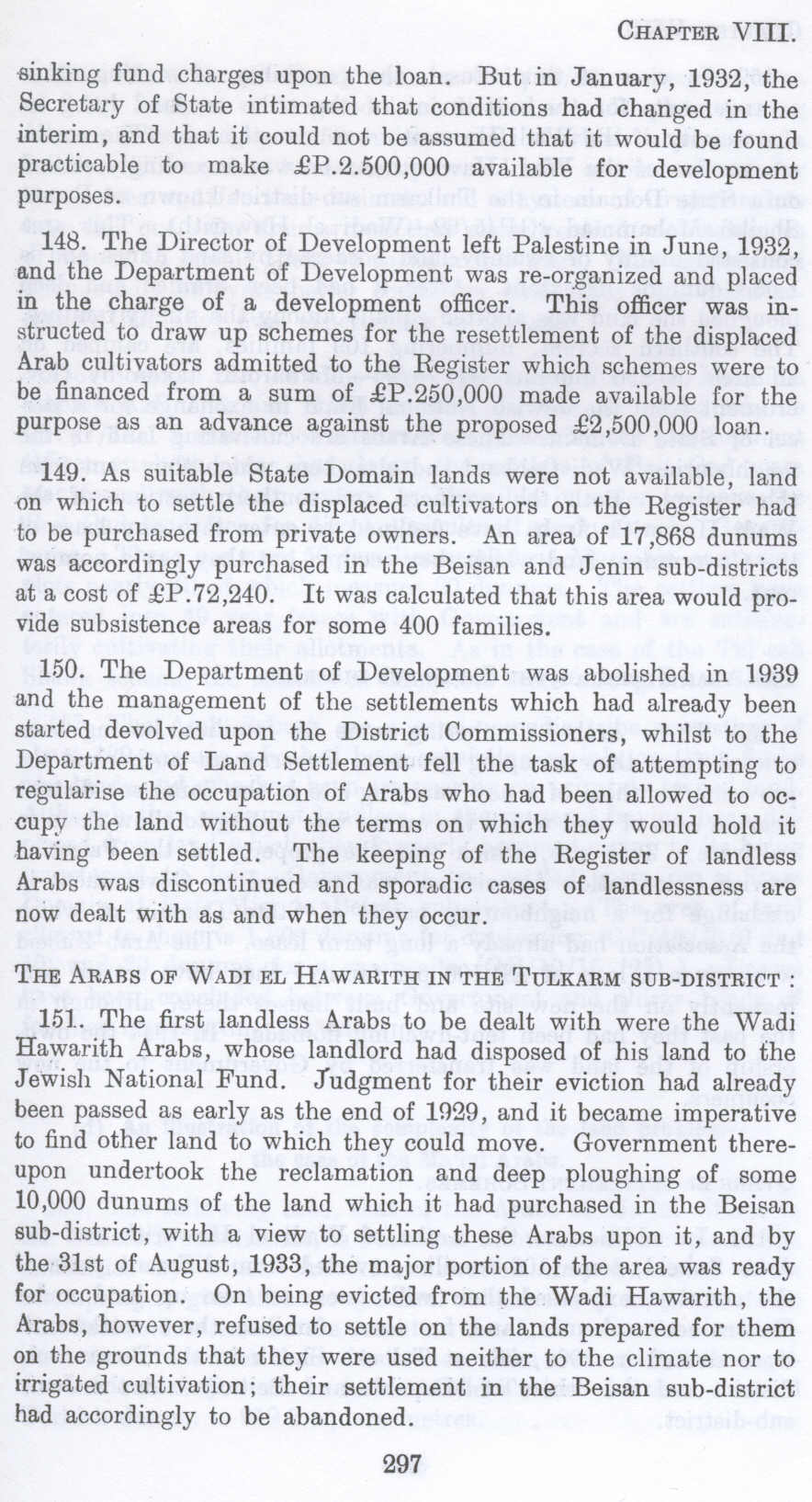 148. The Director of Development left Palestine in June, 1932, and the Department of Development was re-organized and placed in the charge of a development officer. This officer was instructed to draw up schemes for the resettlement of the displaced Arab cultivators admitted to the Register which schemes were to be financed from a sum of £P.250,000 made available for the purpose as an advance against the proposed £2 ,500 ,000 loan.
