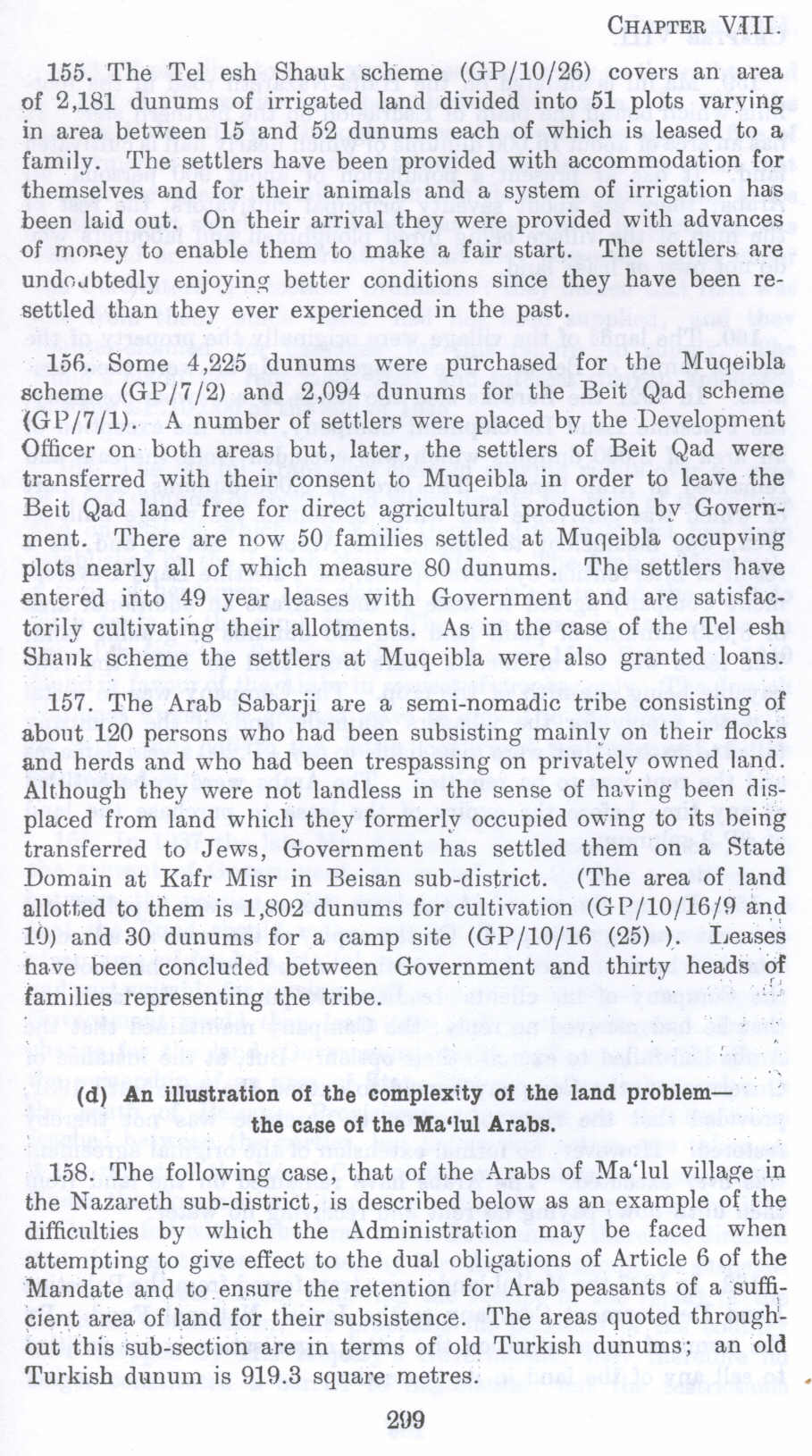 158. The following case, that of the Arabs of Ma'lul village in the Nazareth sub-district, is described below as an example of the difficulties by which the Administration may be faced when attempting to give effect to the dual obligations of Article 6 of the Mandate and to. ensure the retention for Arab peasants of a sufficient area of land for their subsistence. The areas quoted throughout this sub-section are in terms of old Turkish dunums; an old Turkish dunum is 919.3 square metres.