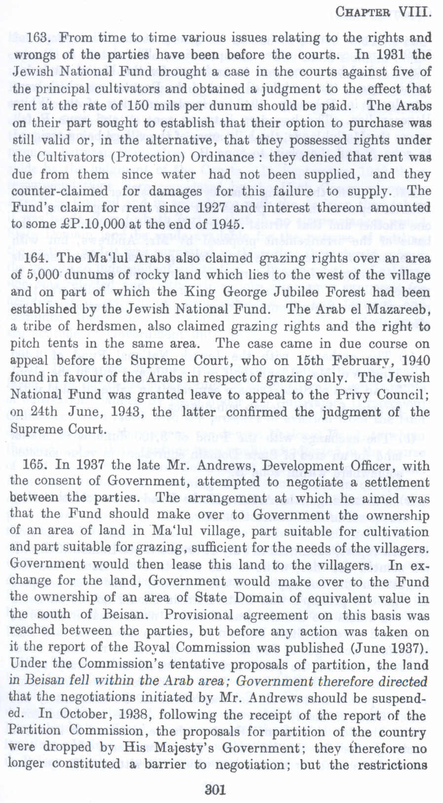 165. In 1937 the late Mr. Andrews, Development Officer, with the consent of Government, attempted to negotiate a settlement between the parties. The arrangement at which he aimed was that the Fund should make over to Government the ownership of an area of land in Ma'lul village, part suitable for cultivation and part suitable for grazing, sufficient for the needs of the villagers. Government would then lease this land to the villagers. In exchange for the land, Government would make over to the Fund the ownership of an area of State Domain of equivalent value in the south of Beisan. Provisional agreement on this has is was reached between the parties, but before any action was taken on it the report of the Royal Commission was published (June 1937). Under the Commission's tentative proposals of partition, the land in Beisan fell within the Arab area; Government therefore directed that the negotiations initiated by Mr. Andrews should be suspended. In October, 1938, following the receipt of the report of the Partition Commission, the proposals for partition of the country were dropped by His Majesty's Government; they therefore no longer constituted a barrier to negotiation; but the restrictions