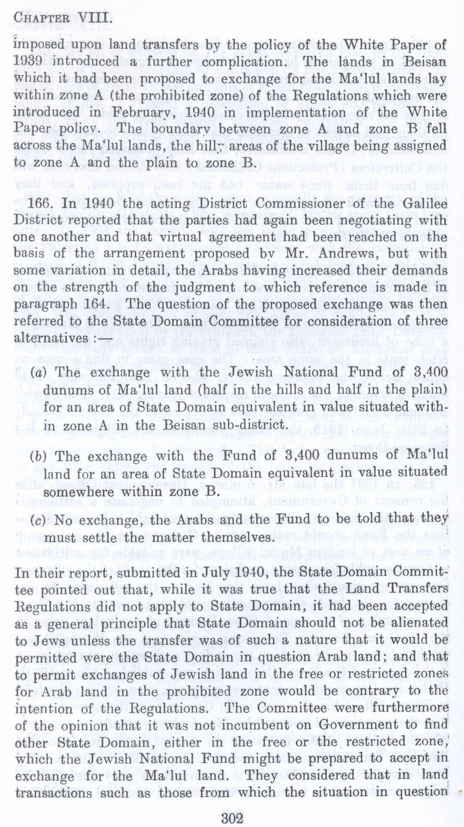 166. In 1940 the acting District Commissioner of the Galilee District reported that the parties had again been negotiating with one another and that virtual agreement had been reached on the has is of the arrangement proposed by Mr. Andrews, but with some variation in detail, the Arabs having increased their demands on the strength of the judgment to which reference is made in paragraph 164. The question of the proposed exchange was then referred to the State Domain Committee for consideration of three alternatives :~