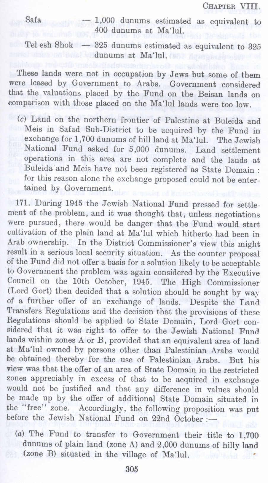 171. During 1945 the Jewish National Fund pressed for settlement of the problem, and it was thought that, unless negotiations were pursued, there would be danger that the Fund would start cultivation of the plain land at Ma'lul which hitherto bad been in Arab ownership. In the District Commissioner's view this might result in a serious local security situation. As the counter proposal of the Fund did not offer a has is for a solution likely to be acceptable to Government the problem was again considered by the Executive Council on the 10th October, 1945. The High Commissioner (Lord Gort) then decided that a solution should be sought by way of a further offer of an exchange of lands. Despite the Land Transfers Regulations and the decision that the provisions of these Regulations should be applied to State Domain, Lord Gort considered that it was right to offer to the Jewish National Fund lands within zones A or B, provided that an equivalent area of land at Ma'lul owned by persons other than Palestinian Arabs would be obtained thereby for the use of Palestinian Arabs. But bis view was that the offer of an area of State Domain in the restricted zones appreciably in excess of that to be acquired in exchange would not be justified and that any difference in values should be made up by the offer of additional State Domain .situated in the "free" zone. Accordingly, the following proposition was put before the Jewish National Fund on 22nd October :-