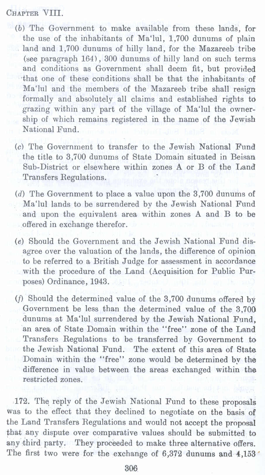 172. The reply of the Jewish National Fund to these proposals was to the effect that they declined to negotiate on the has is of the Land Transfers Regulations and would not accept the proposal that any dispute over comparative values should be submitted to any third party. They proceeded to make three alternative offers. The first two were for the exchange of 6,372 dunums and 4,153