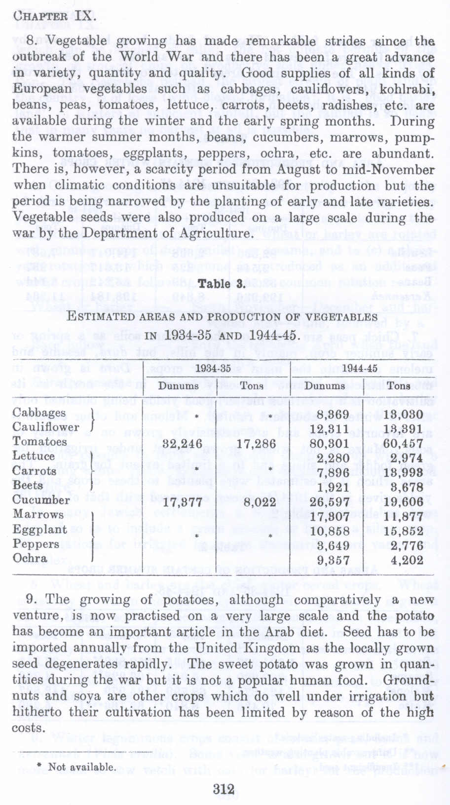 Ochre, 9,857 4,202 9. The growing of potatoes, although comparatively a new venture, is now practised on a very large scale and the potato has become an important article in the Arab diet. Seed has to be imported annually from the United Kingdom as the locally grown seed degenerates rapidly. The sweet potato was grown in quantities during the war but it is not a popular human food. Groundnuts and soya are other crops which do well under irrigation but hitherto their cultivation has been limited by reason of the high costs.