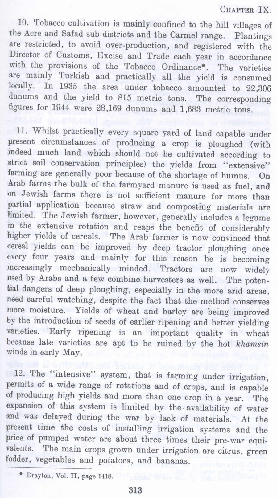 11. Whilst practically every square yard of land capable under present circumstances of producing a crop is ploughed (with indeed much land which should not be cultivated according to strict soil conservation principles) the yields from "extensive" farming are generally poor because of the shortage of humus. On Arab farms the bulk of the farmyard manure is used as fuel, and on Jewish farms there is not sufficient manure for more than partial application because straw and composting materials are limited. The Jewish farmer, however, generally includes a legume in the extensive rotation and reaps the benefit of considerably higher yields of cereals. The Arab farmer is now convinced that cereal yields can be improved by deep tractor ploughing once every four years and mainly for this reason he is becoming increasingly mechanically minded. Tractors are now widely used by Arabs and a few combine harvesters as well. The potential dangers of deep ploughing, especially in the more arid areas, need careful watching, despite the fact that the method conserves more moisture. Yields of wheat and barley are being improved by the introduction of seeds of earlier ripening and better yielding varieties. Early ripening is an important quality in wheat because late varieties are apt to be ruined by the hot khamsin winds in early May.