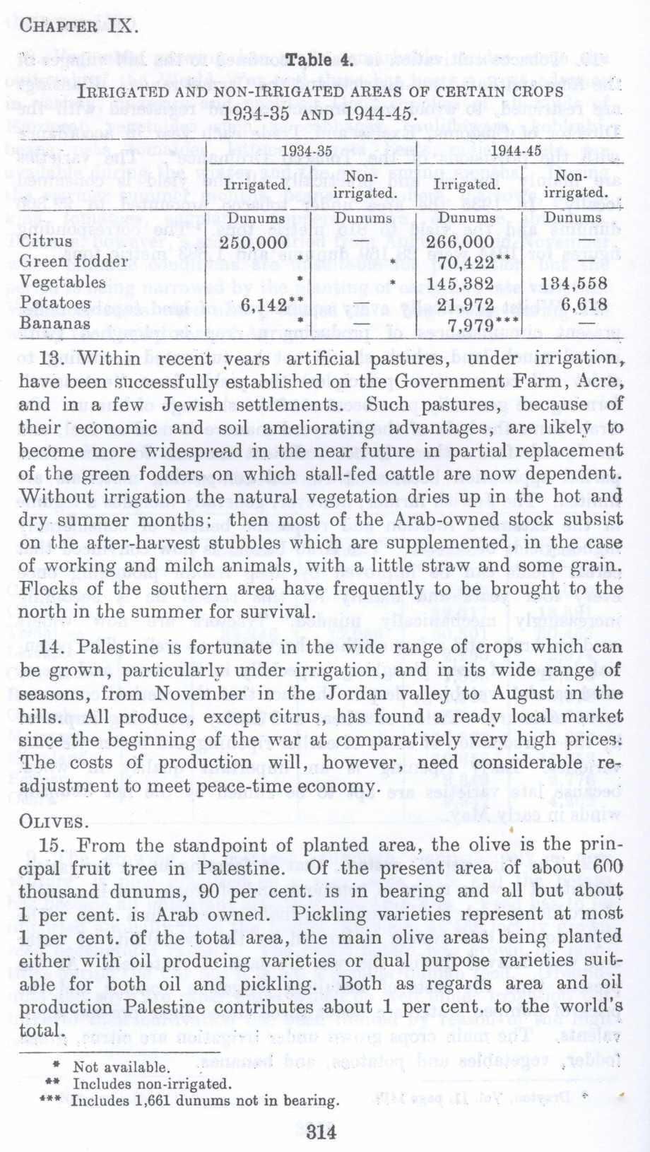 Olive production in Palestine before 1948 (Nakba), British Mandate: A Survey of Palestine: Volume I - Page 314. Chapter IX: Agriculture: Section 1: Agriculture Production: (b) Crops and Cropping: Table 4: Irrigated and None Irrigated of Certain Crops in 1934-1935 and 1944-1945. |