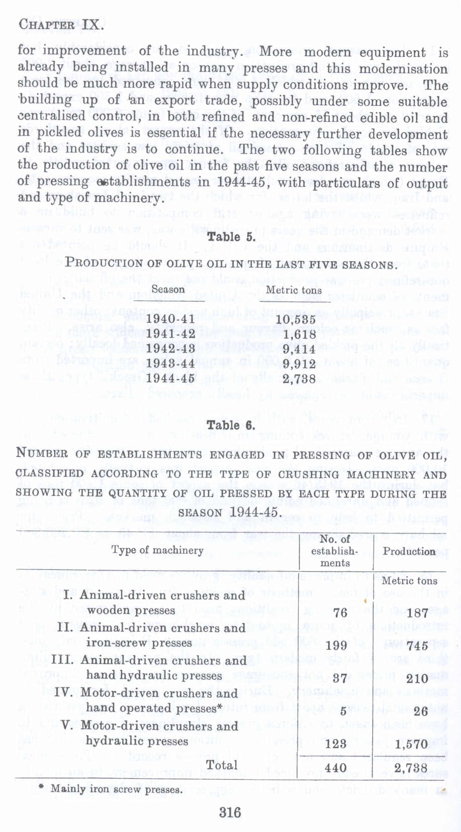 for improvement of the industry. More modern equipment is already being installed in many presses and this modernisation should be much more rapid when supply conditions improve. The 'building up of 'an export trade, possibly under some suitable centralised control, in both refined and non-refined edible oil and in pickled olives is essential if the necessary further development of the industry is to continue. The two following tables show the production of olive oil in the past five seasons and the number of pressing establishments in 1944-45, with particulars of output and type of machinery.