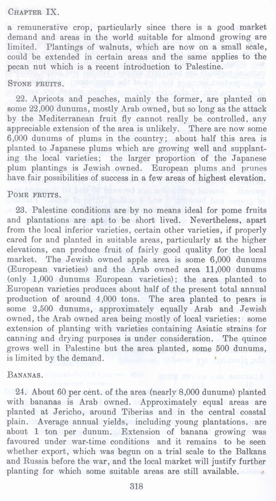 Stone Fruits, Pome Fruits, & Bananas production in Palestine before 1948 (Nakba), British Mandate: A Survey of Palestine: Volume I - Page 318. Chapter IX: Agriculture: Section 1: Agriculture Production: (b) Crops and Cropping |