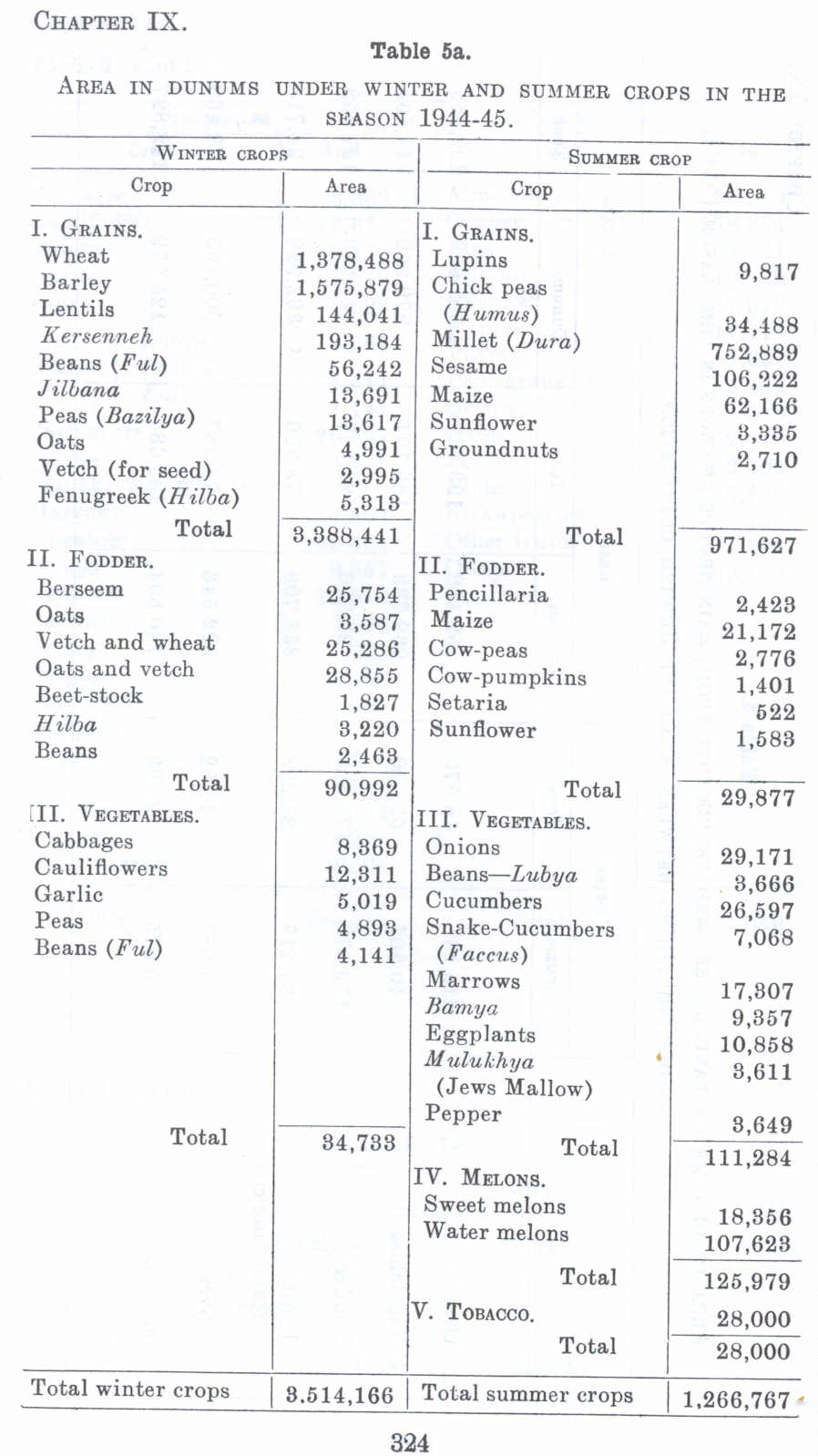 Palestinian Area in Dunums of Land Under Winter and Summer Crops in The Season 1944 - 45 before Nakba, British Mandate: A Survey of Palestine: Volume I - Page 324. Chapter IX: Agriculture: Section 1: Agriculture Production: (c) Statistical Production: Table 5a |