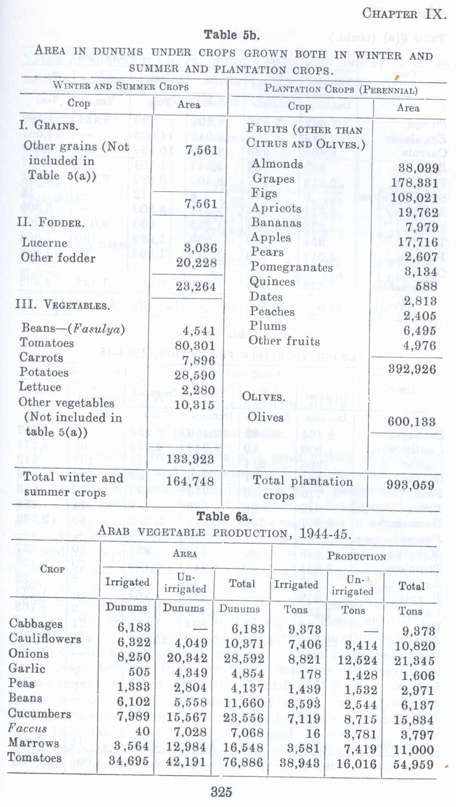 Palestinian Area in Dunums of Land Under Crops Grown in Winter and Summer and Plantation Crops in The Season. Table 6a: Arab Vegetable Production 1944 - 45 before Nakba, British Mandate: A Survey of Palestine: Volume I - Page 325. Chapter IX: Agriculture: Section 1: Agriculture Production: (c) Statistical Production: Table 5b