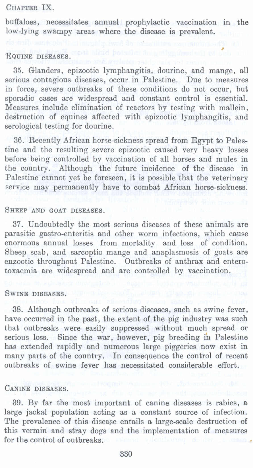 Animal Health in Palestine before 1948 (Nakba): Bovine Diseases,Equine Diseases, Sheep And Goat Diseases, Swine Diseases & Canine Diseases, British Mandate: A Survey of Palestine: Volume I - Page 330. Chapter IX: Agriculture: Section 2: Animal Health and Produce |