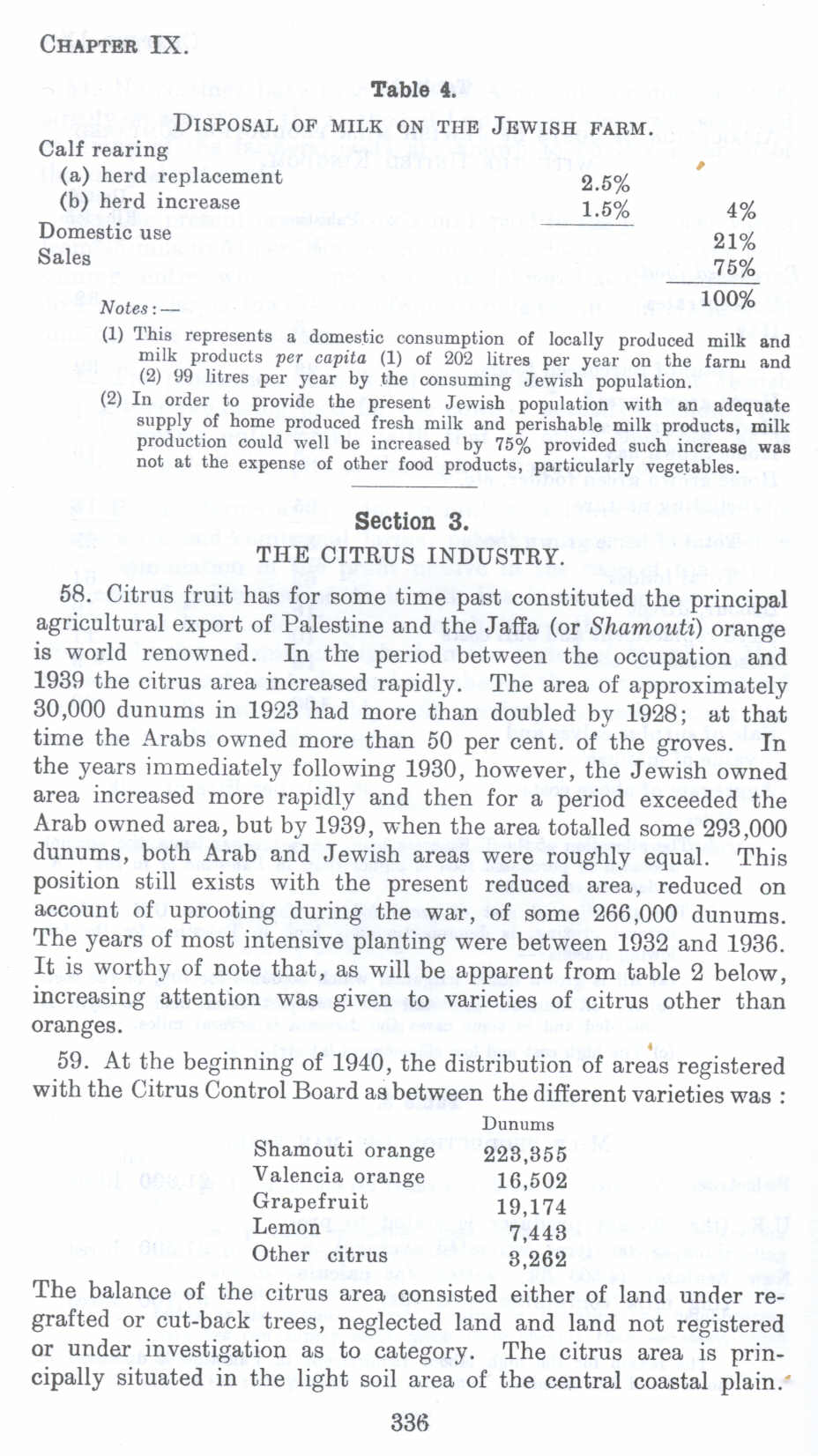 The Citrus Industry in Palestine before 1948 (Nakba), British Mandate: A Survey of Palestine: Volume I - Page 336. Chapter IX: Agriculture: Section 2: Animal Health and Produce.(c) Milk Production : Table 4: Disposal of Milk on Jewish/Zionist Farms in Palestine. Section 3 |